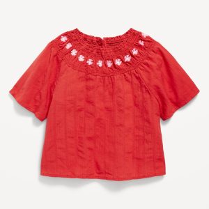 Cropped Short Puff-Sleeve Double-Weave Top for Girls