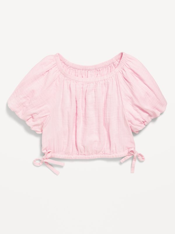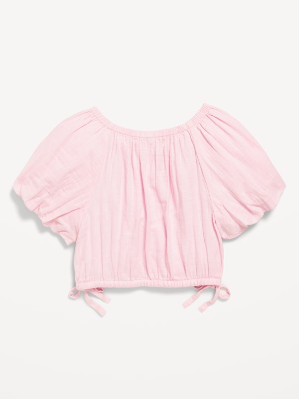 Cropped Short Puff-Sleeve Double-Weave Top for Girls