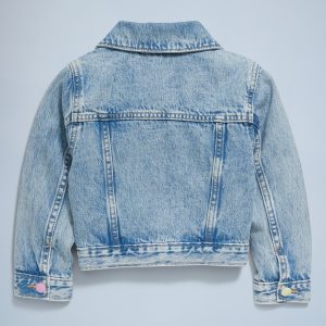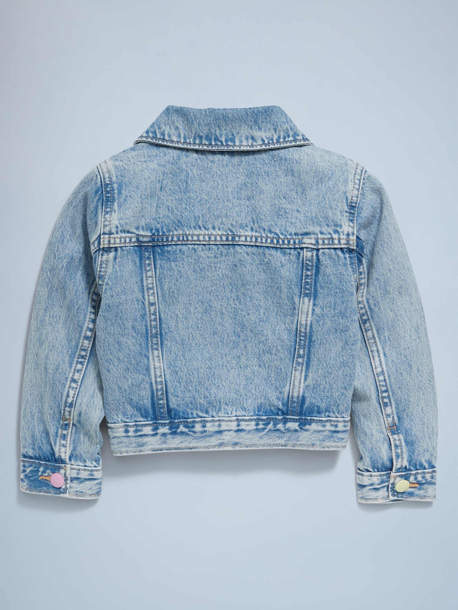 Cropped Trucker Jean Jacket for Toddler Girls: pointed collar, long sleeves, multi-color snap-button placket, faux snap-flap pockets at chest, on-seam welt pockets, #693444