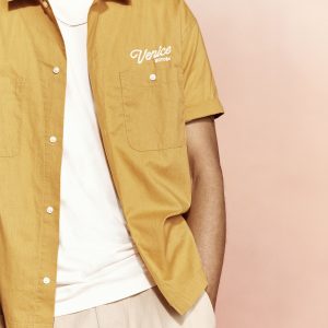 Cropped Utility Pocket Shirt: notched collar, short sleeves, embroidered chest graphic varies, button-patch chest pockets, full-button front, #762369