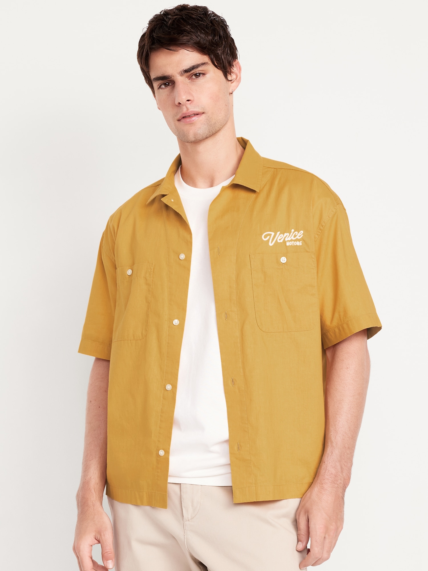 Cropped Utility Pocket Shirt: notched collar, short sleeves, embroidered chest graphic varies, button-patch chest pockets, full-button front, #762369