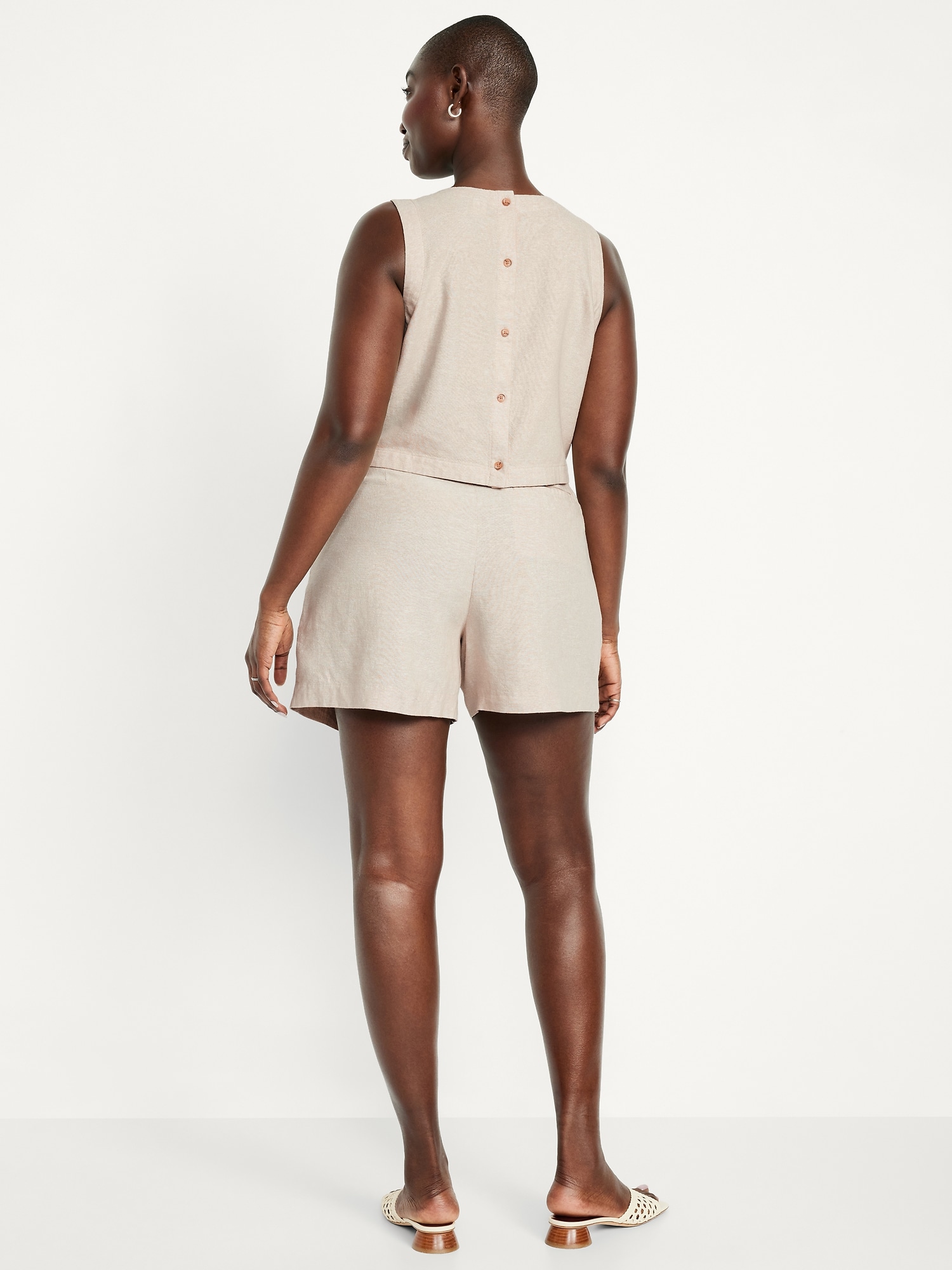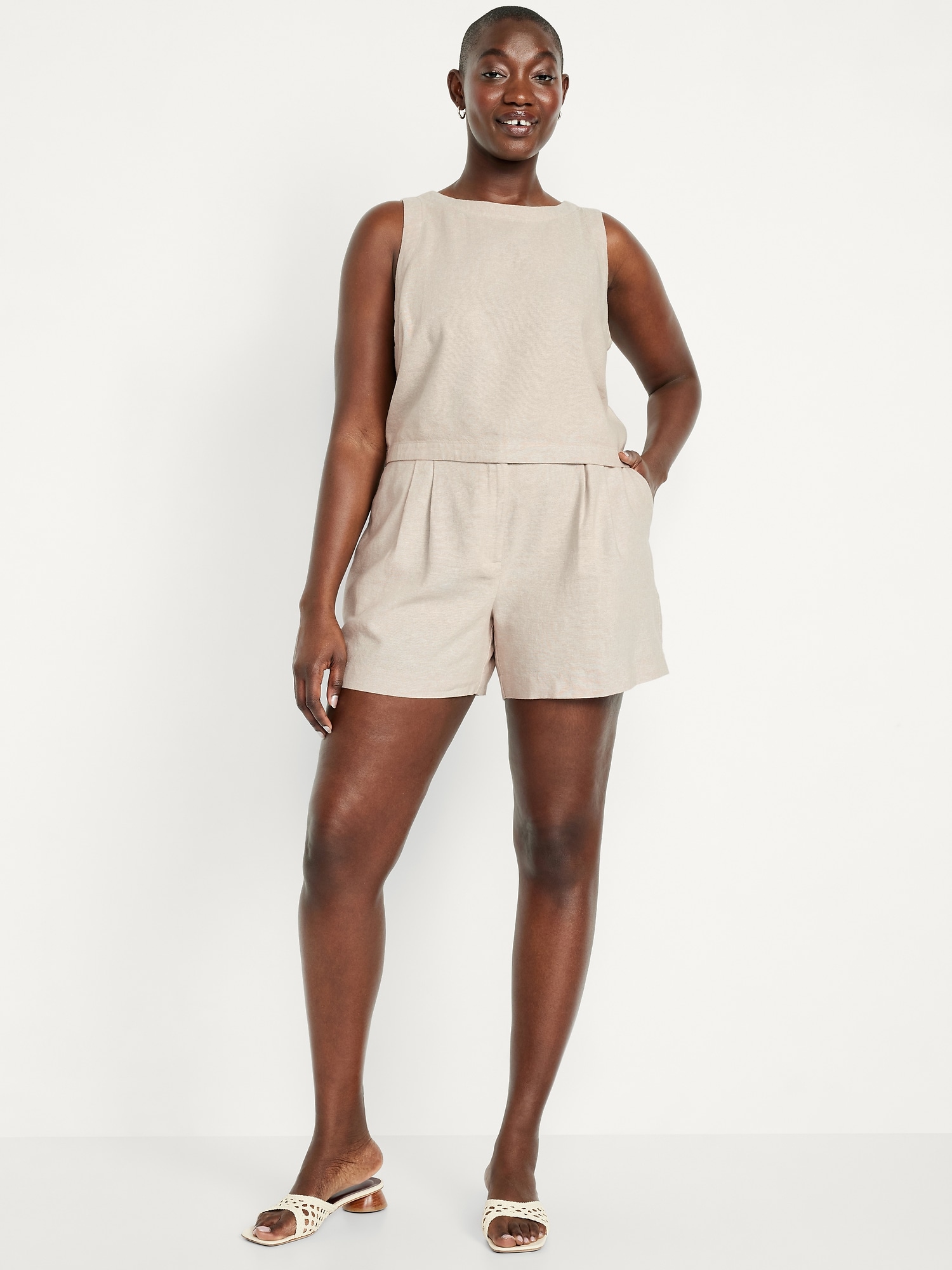 Extra High-Waisted Linen-Blend Taylor Trouser Shorts — 5-inch inseam: extra high adjustable waist, hook-and-bar closure, belt loops, hip pockets, functional back welt pocket, pleated front, #748111