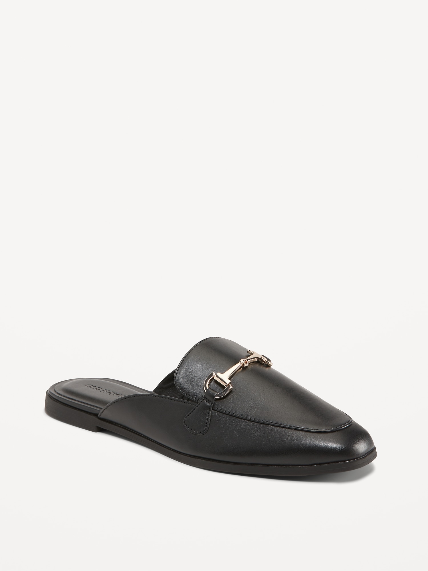 Faux-Leather Loafer Mule Shoes: Faux-leather upper, with buckle front detail, open mule heel, and pointed, square toe., Cushioned faux-leather foot bed., Textured thermoplastic rubber outsole., These shoes are made with a 51% recycled thermoplastic rubber outsole. Less waste in the world ??, #745325