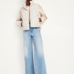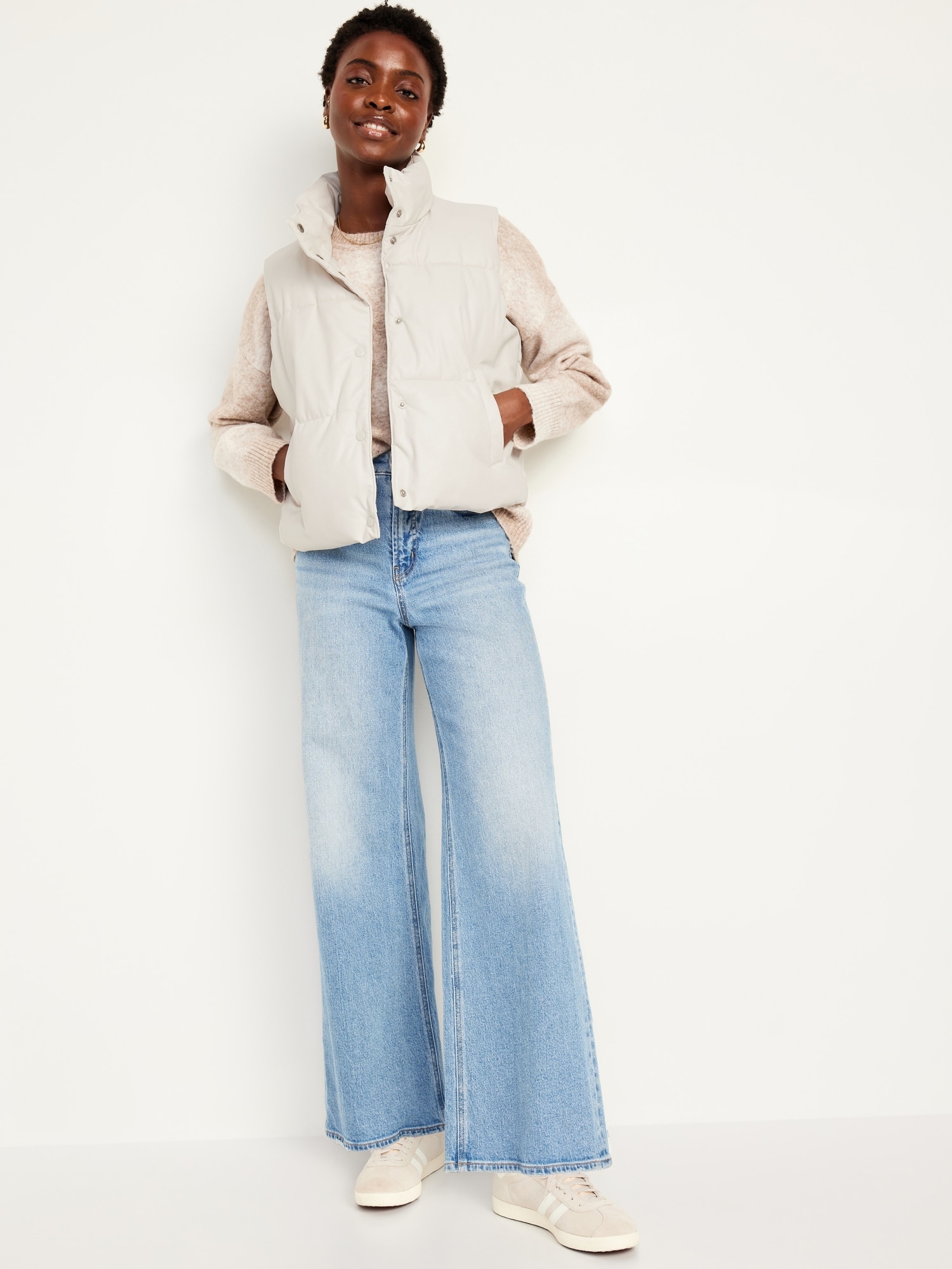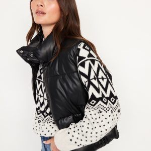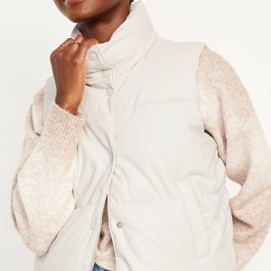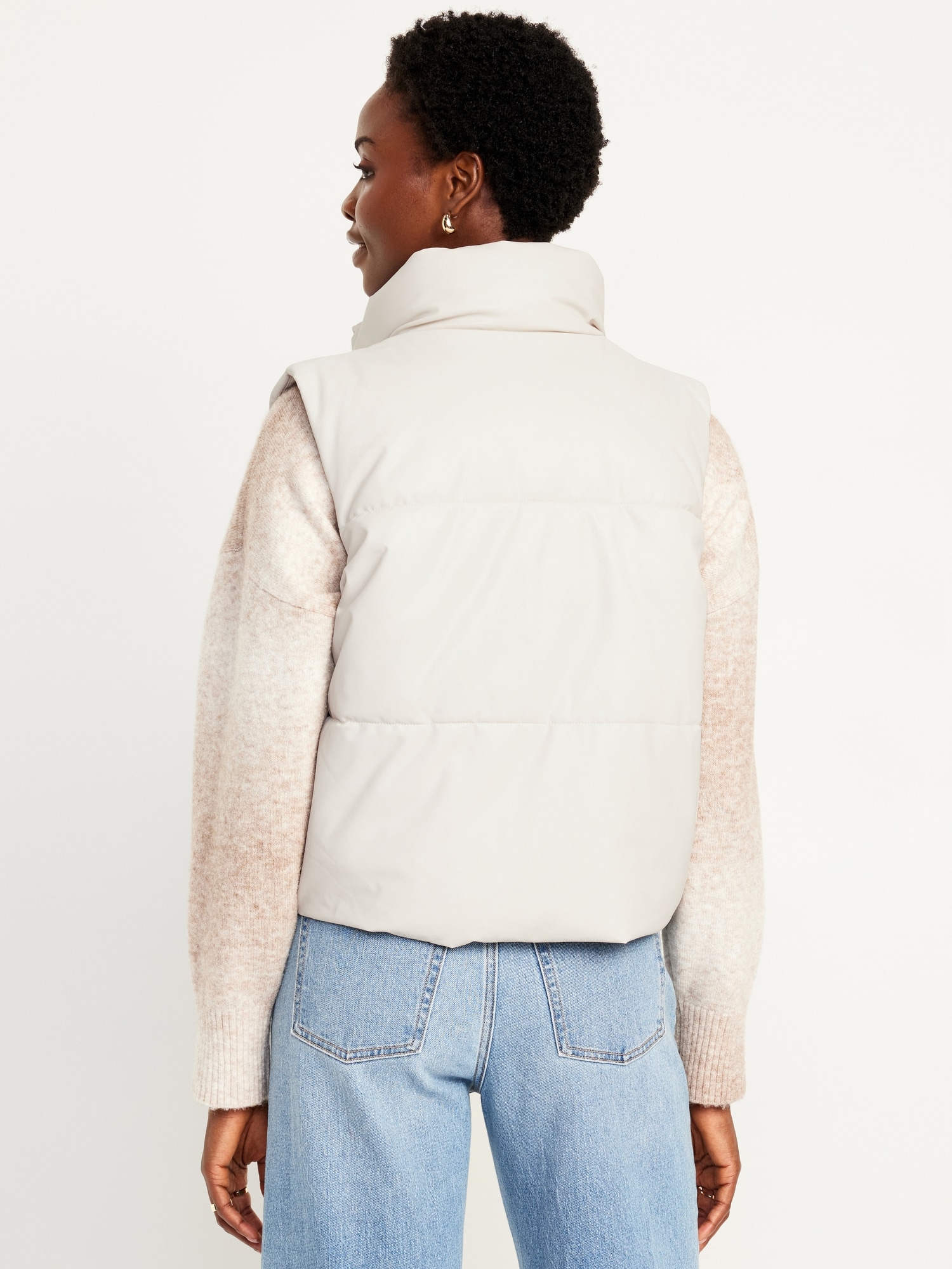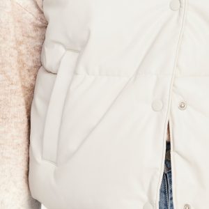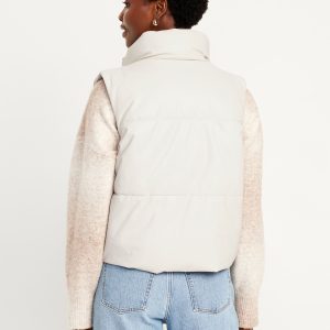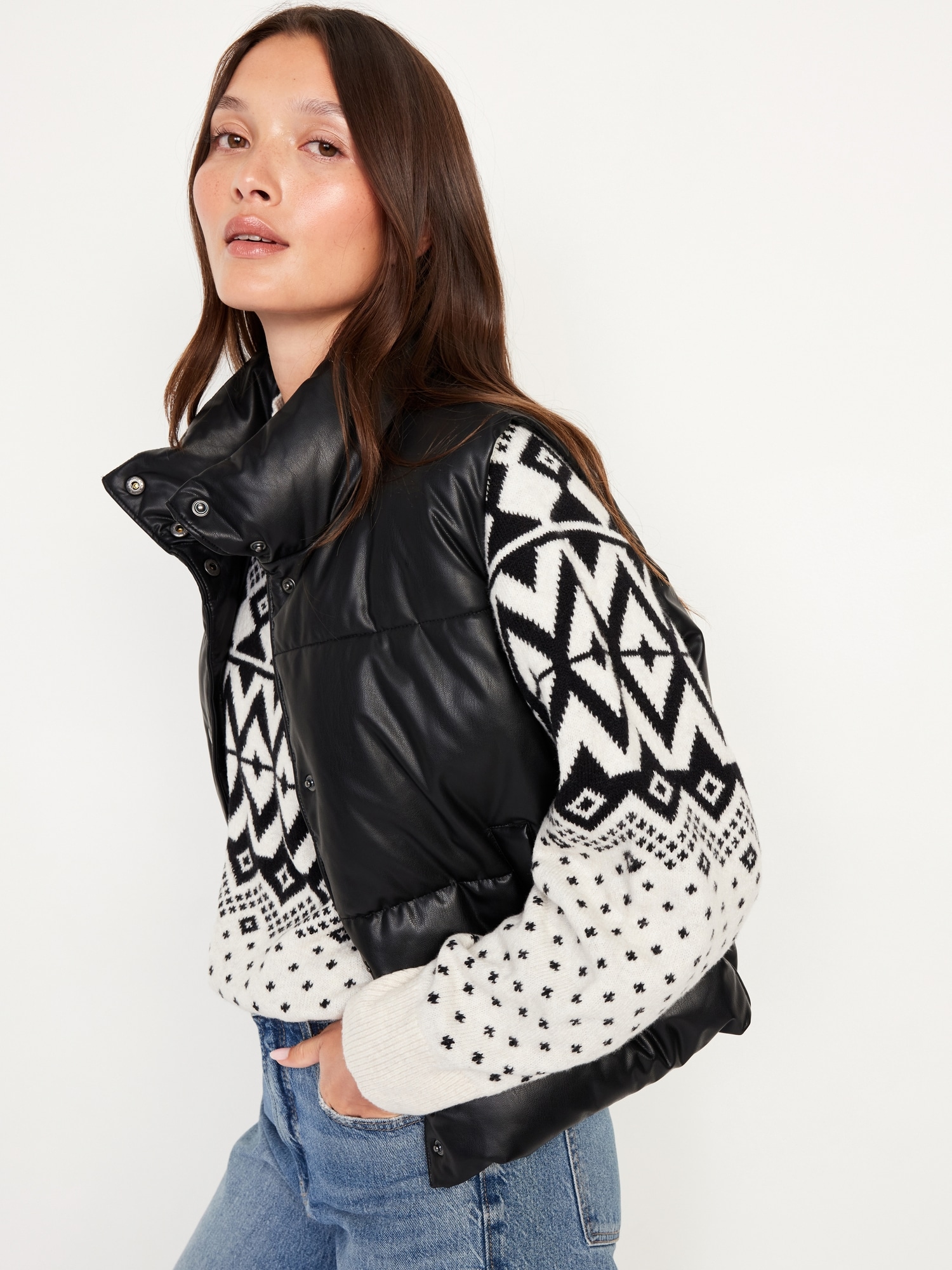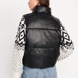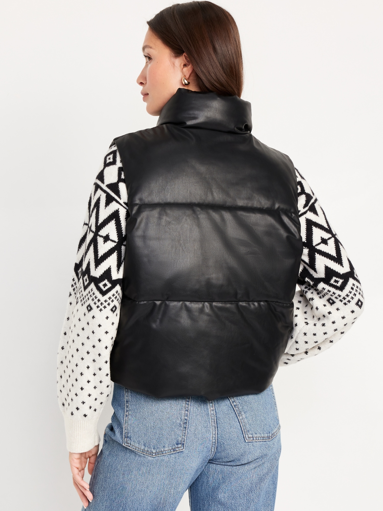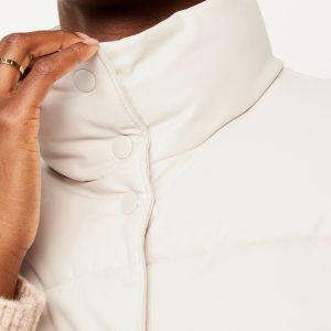 Faux-Leather Puffer Vest: standing collar, sleeveless, snap front, welt pockets, hanging loop, #479489