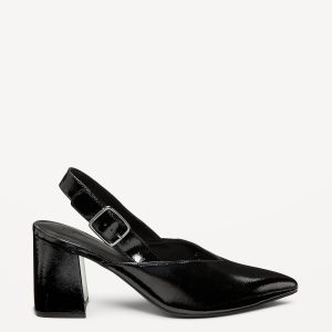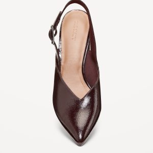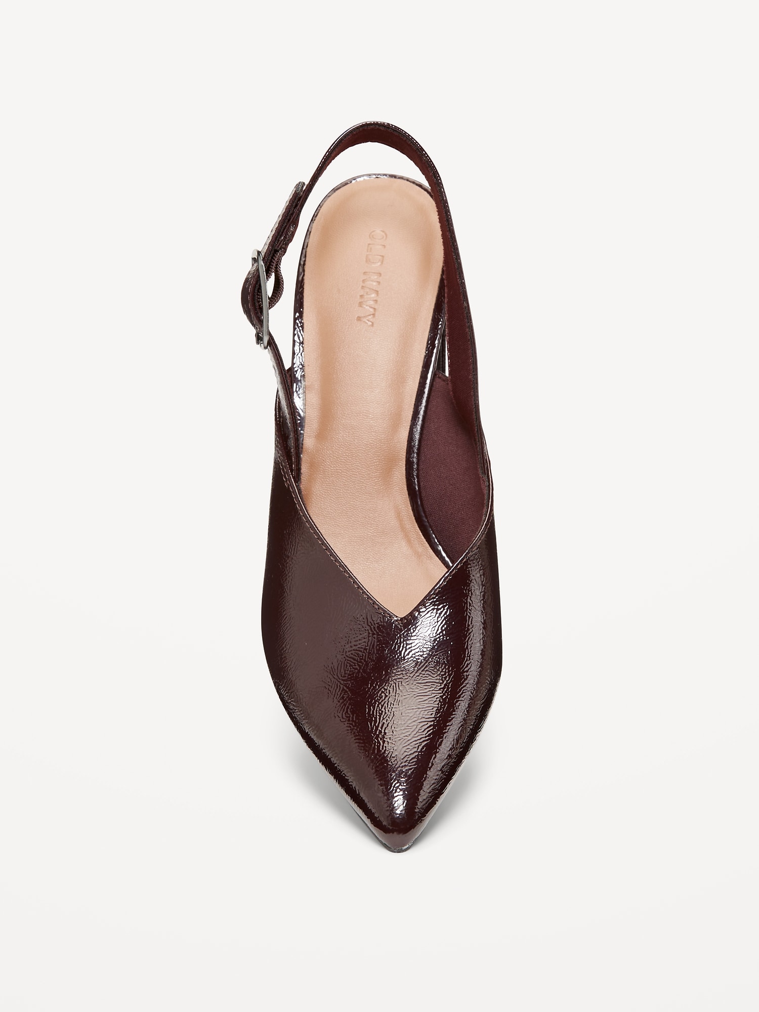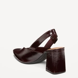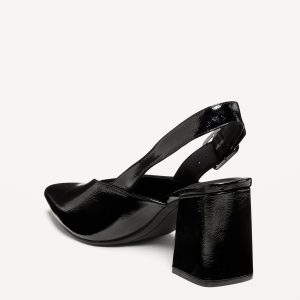 Faux-Leather Slingback Heels for Women: pointed toe, wide buckled ankle strap, block heel, #788065