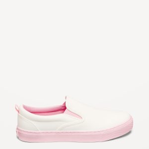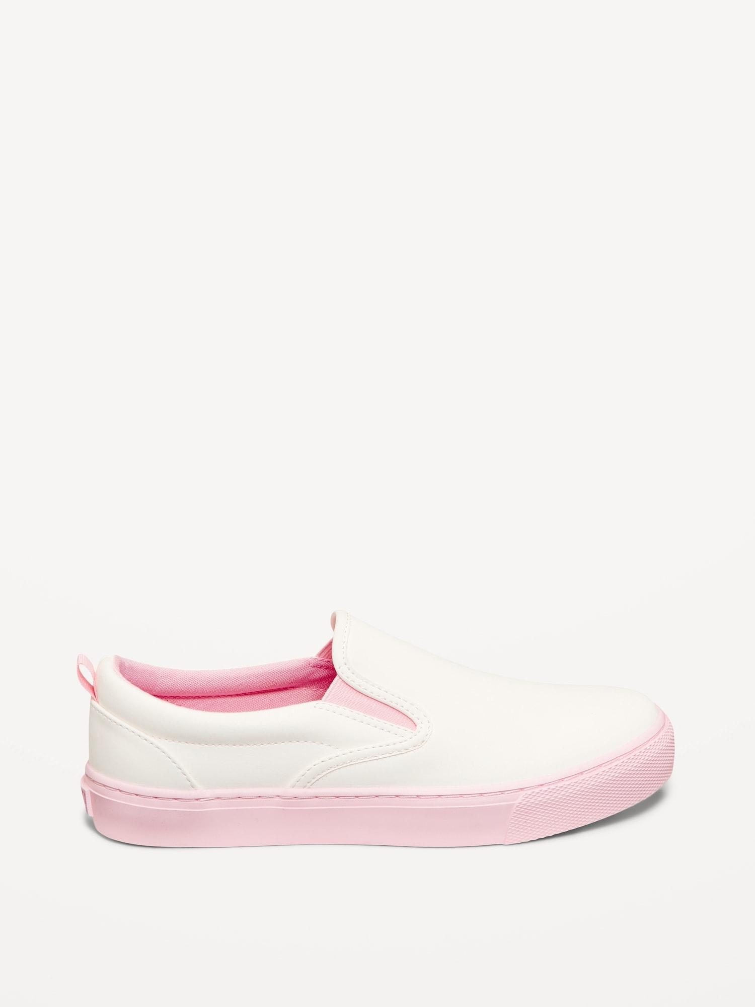 Faux-Leather Slip-On Sneakers for Girls: webbed goring at sides, round toe, cushioned foot bed, rubber midsole, vulcanized outsole, pull tab at heel, #762461