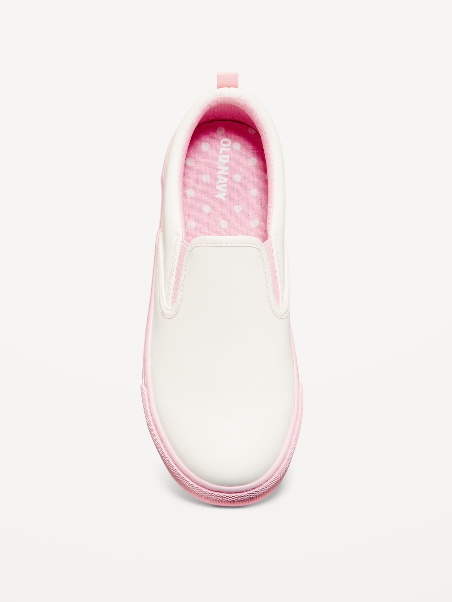 Faux-Leather Slip-On Sneakers for Girls: webbed goring at sides, round toe, cushioned foot bed, rubber midsole, vulcanized outsole, pull tab at heel, #762461