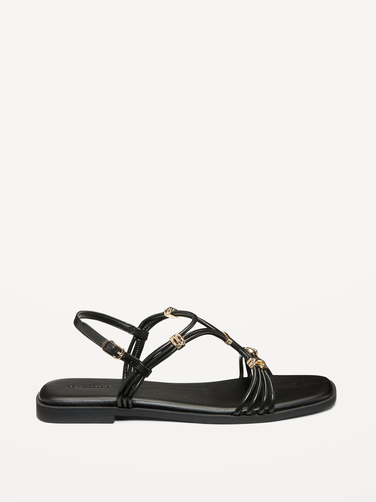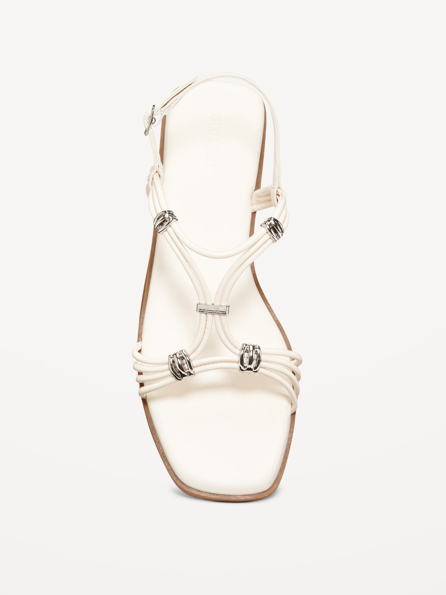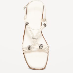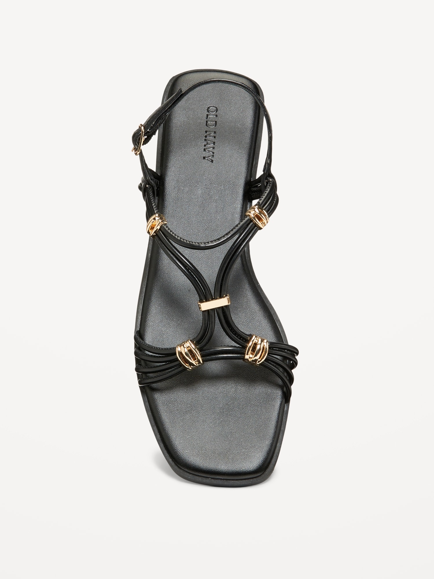 Faux-Leather Strappy Hardware Sandals: faux-leather upper, black: knotted gold-tone detail, bone: knotted silver-tone detail, buckle fastening at ankle, cushioned foot bed, #751054