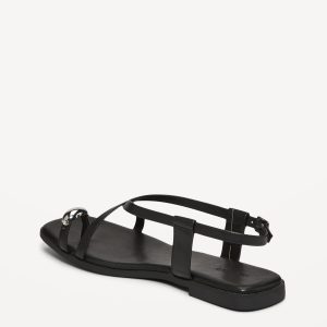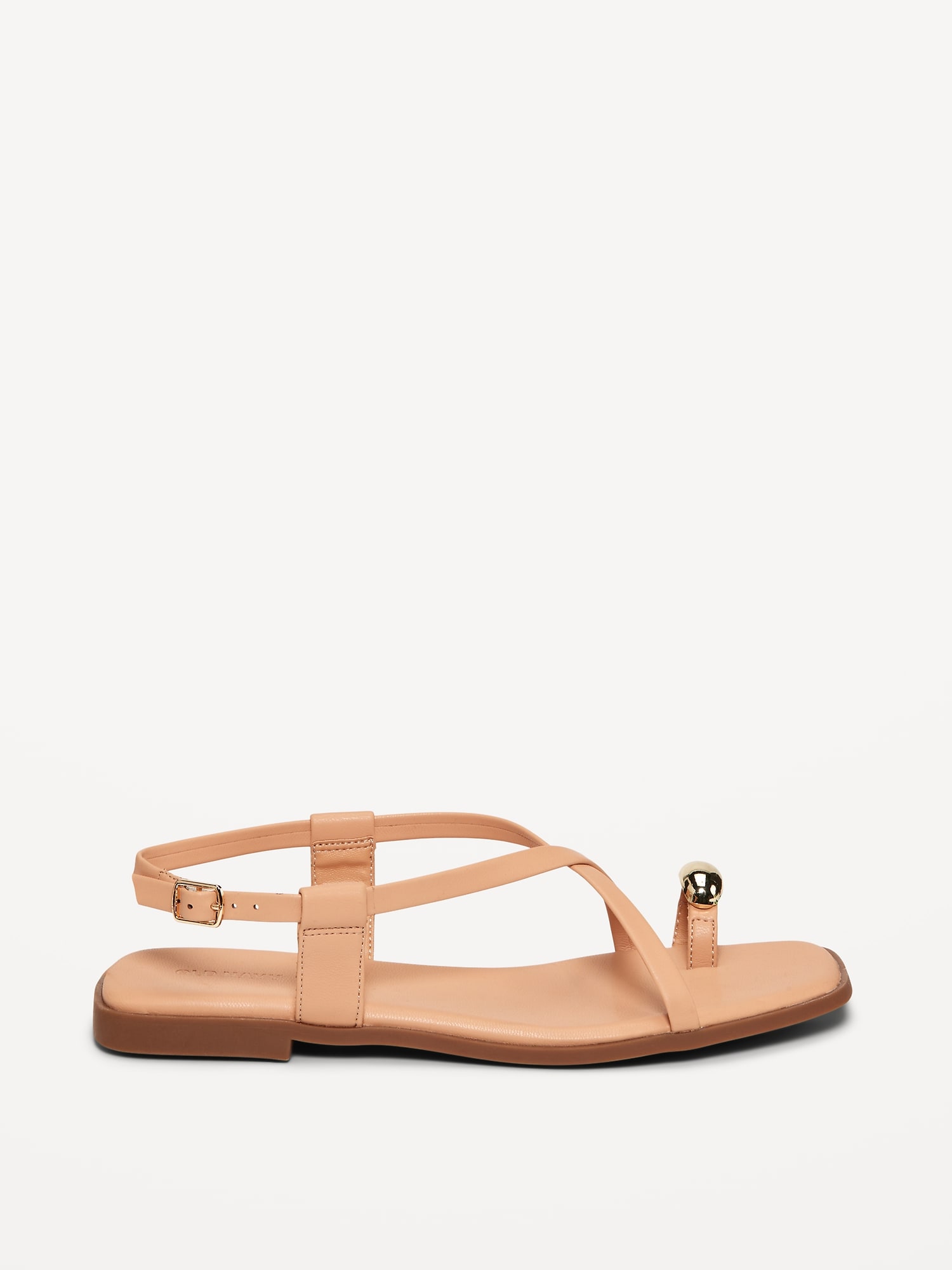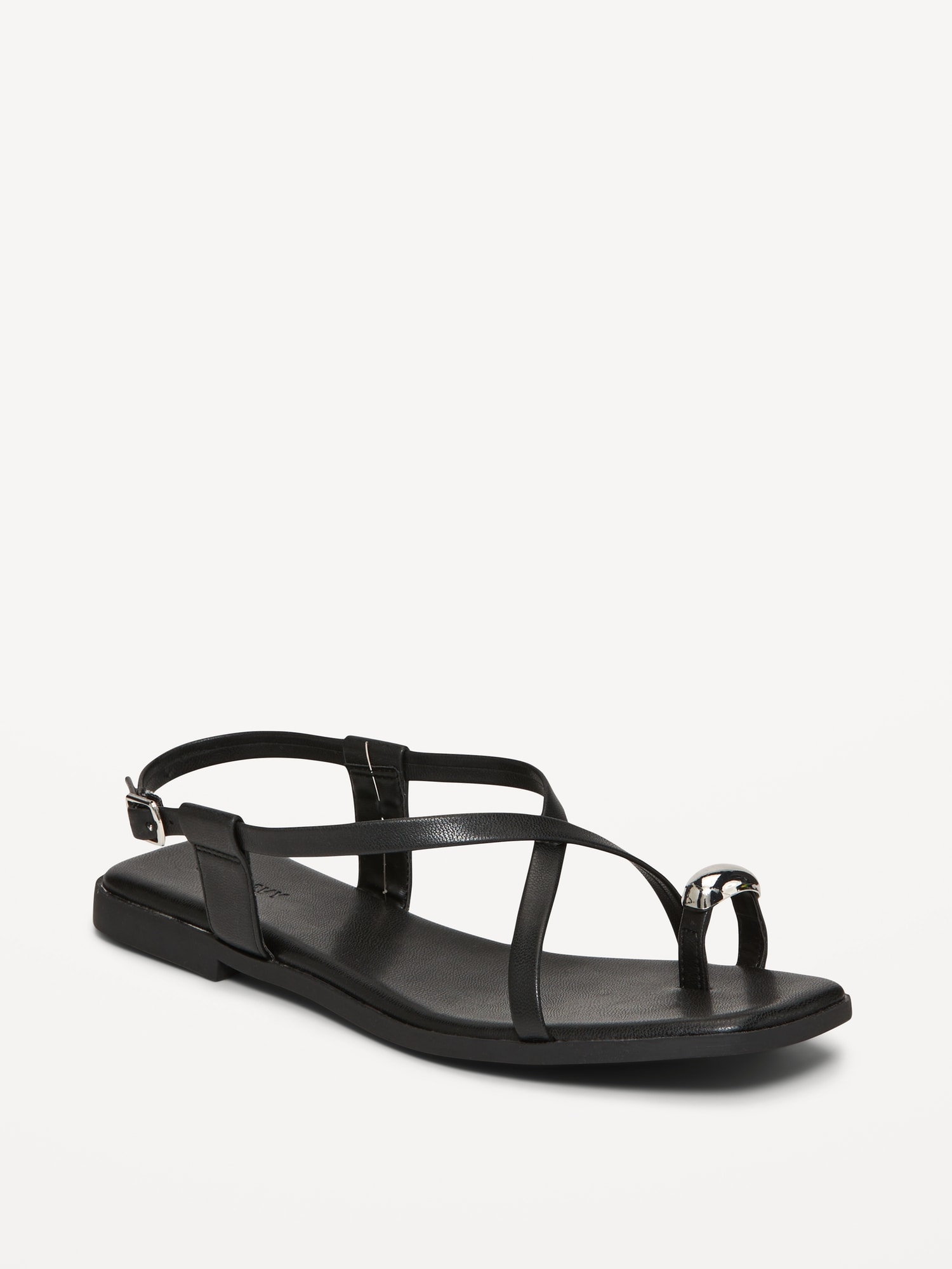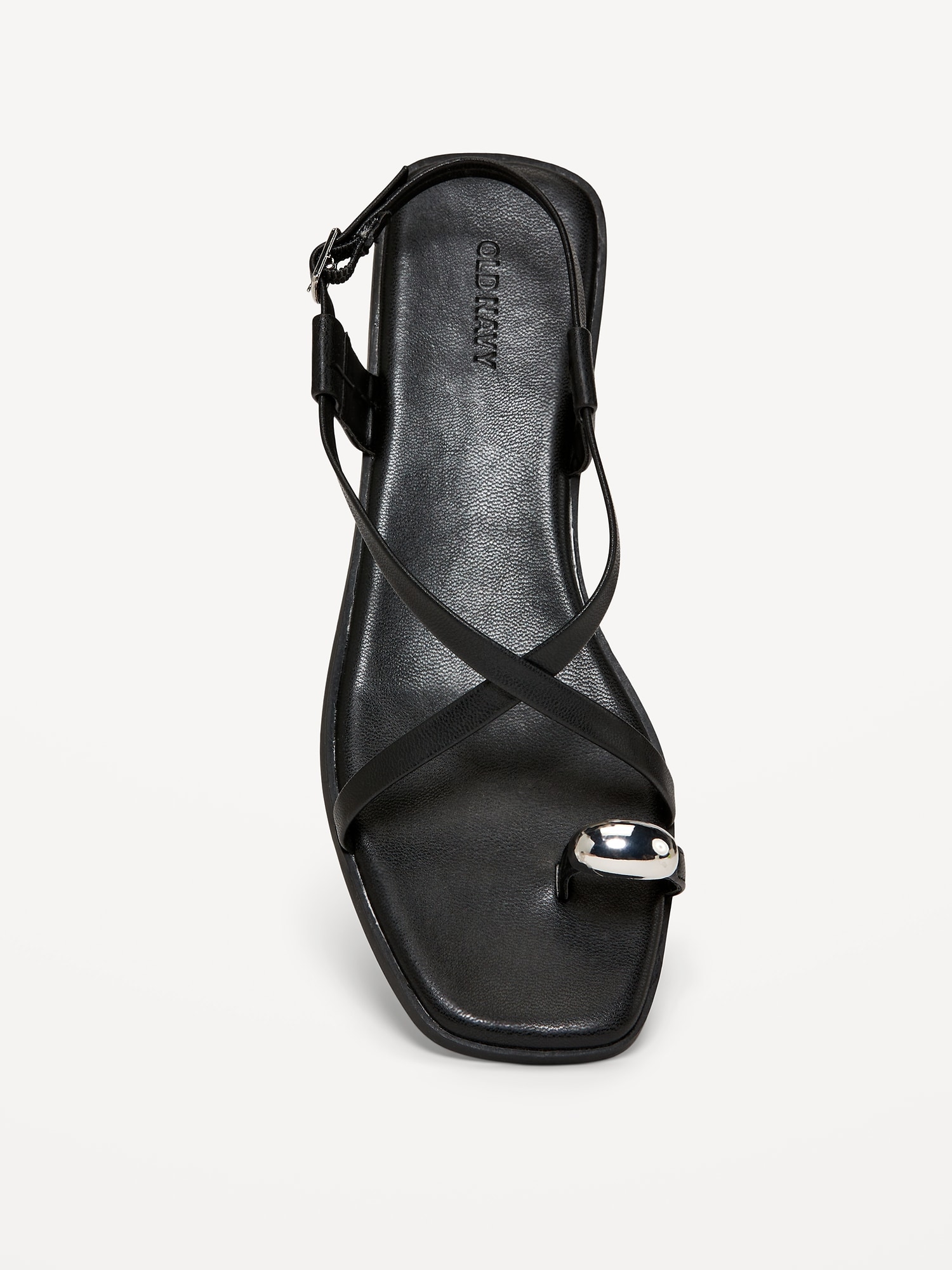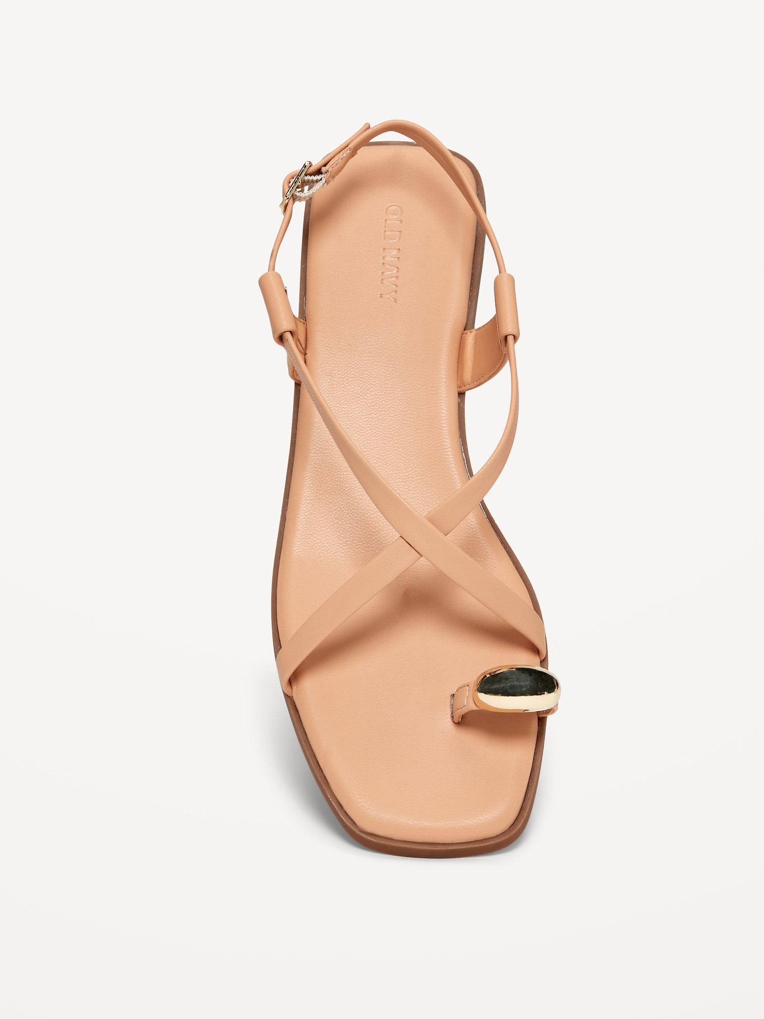 Faux Leather Strappy Toe Ring Sandals: square toe, strappy upper, metal detail at toe, buckle fastening at ankle, cushioned foot bed, #663920