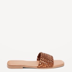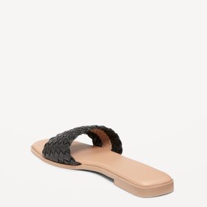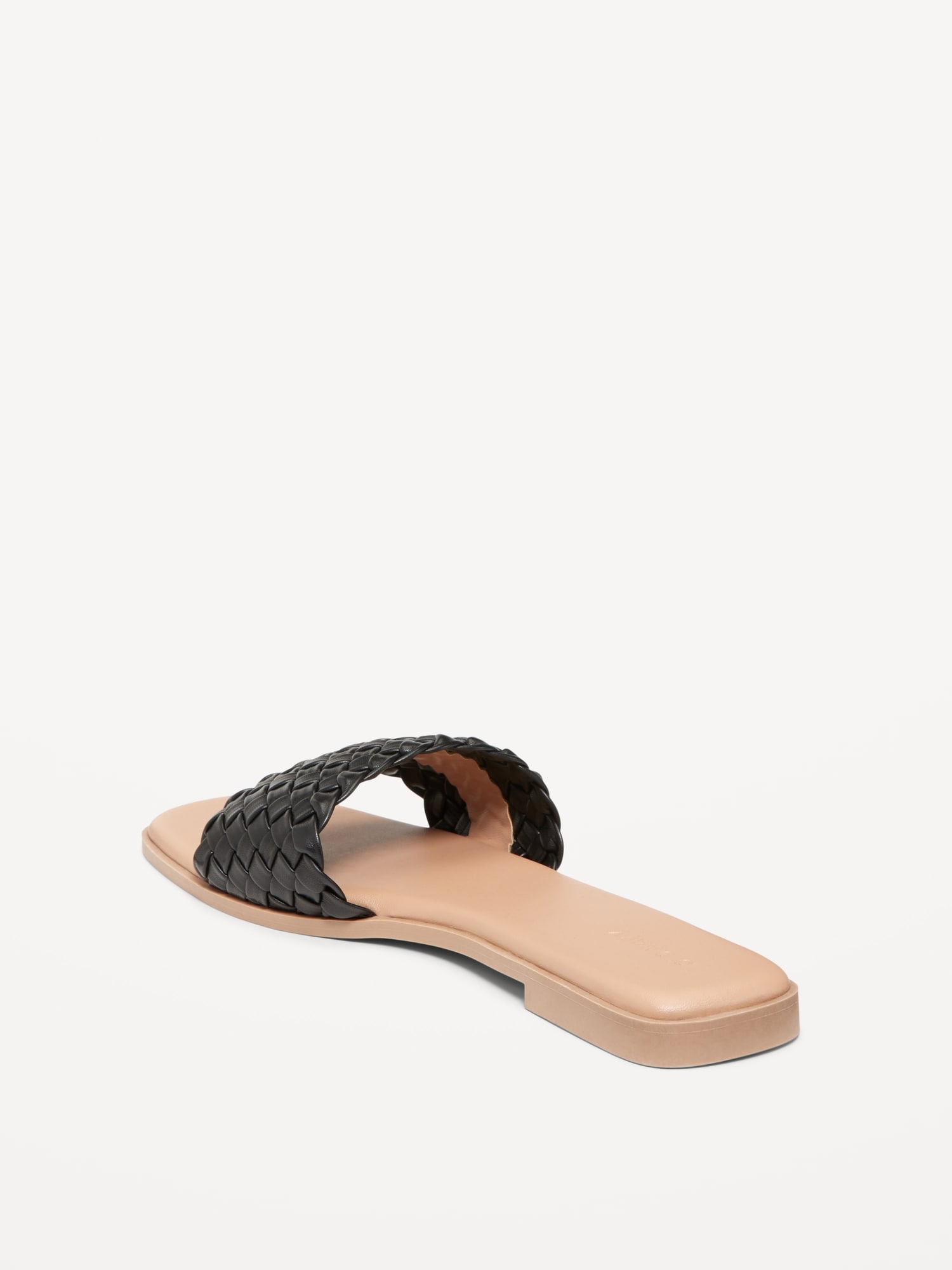 Faux-Leather Woven Slide Sandals: single strap upper, square toe, cushioned foot bed, slide-on style, #684808