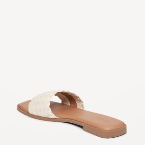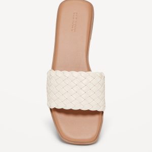 Faux-Leather Woven Slide Sandals: single strap upper, square toe, cushioned foot bed, slide-on style, #684808