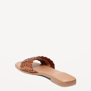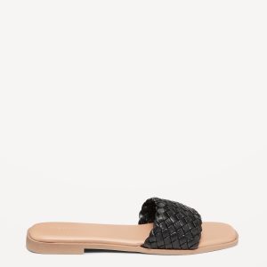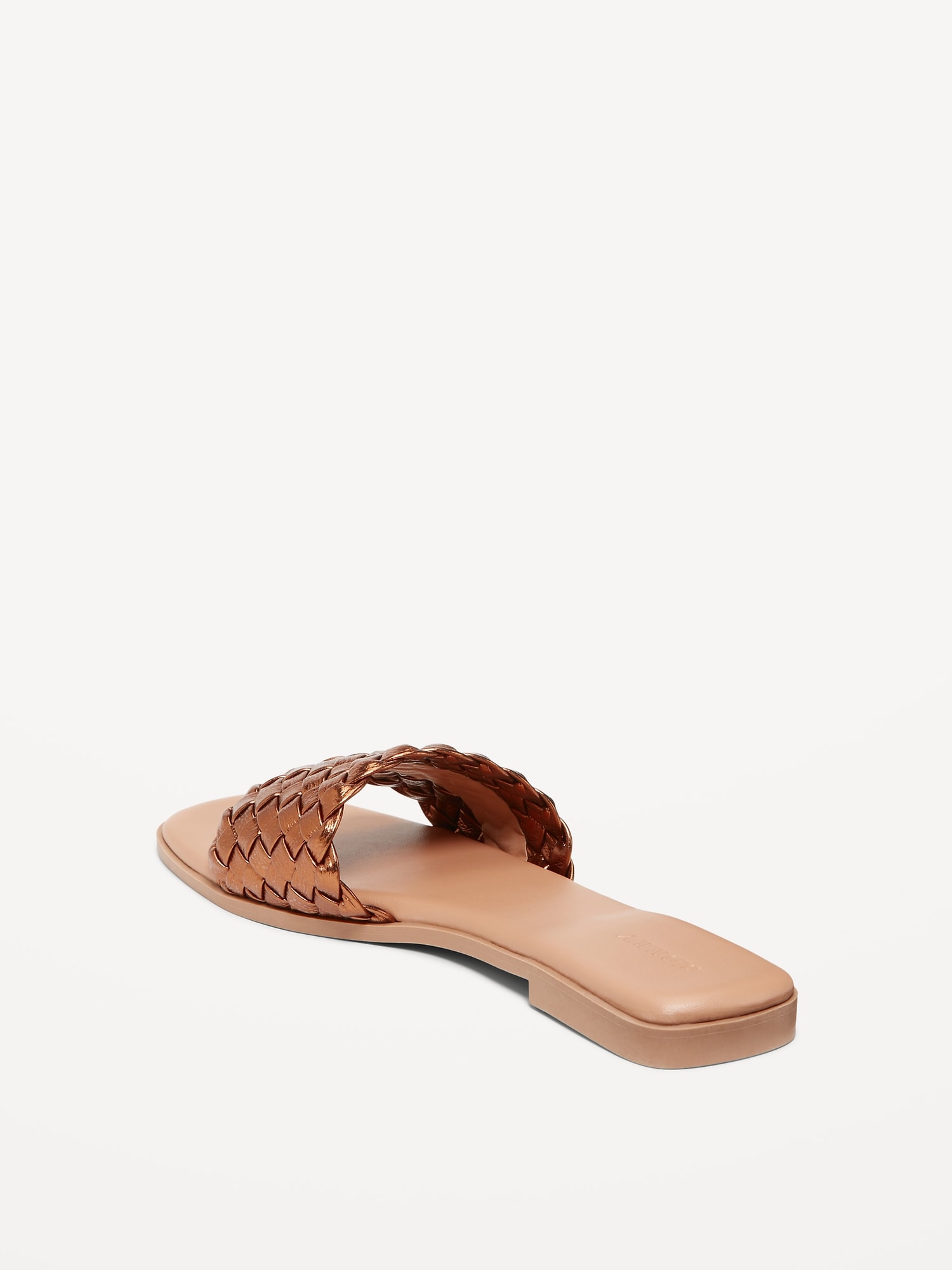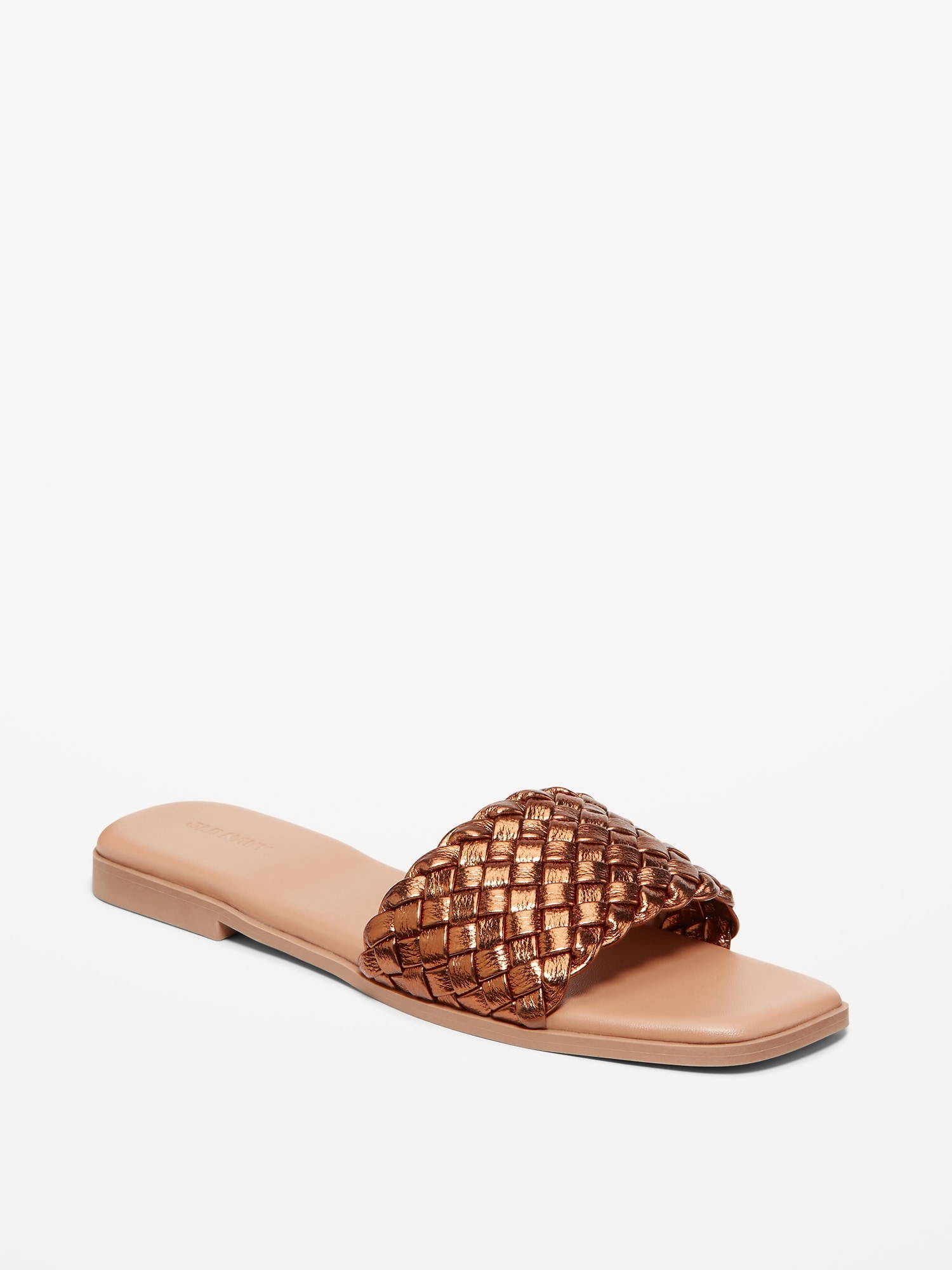 Faux-Leather Woven Slide Sandals: single strap upper, square toe, cushioned foot bed, slide-on style, #684808