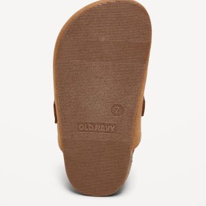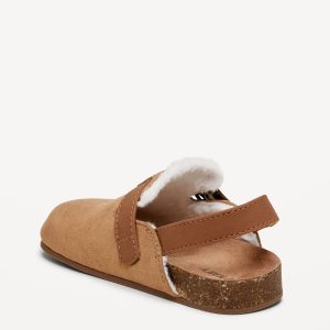 Faux-Suede Clogs for Toddler Girls: buckled strap across foot, adhesive secure close ankle strap, cork midsole and textured outsole, faux-fur trim, #800511
