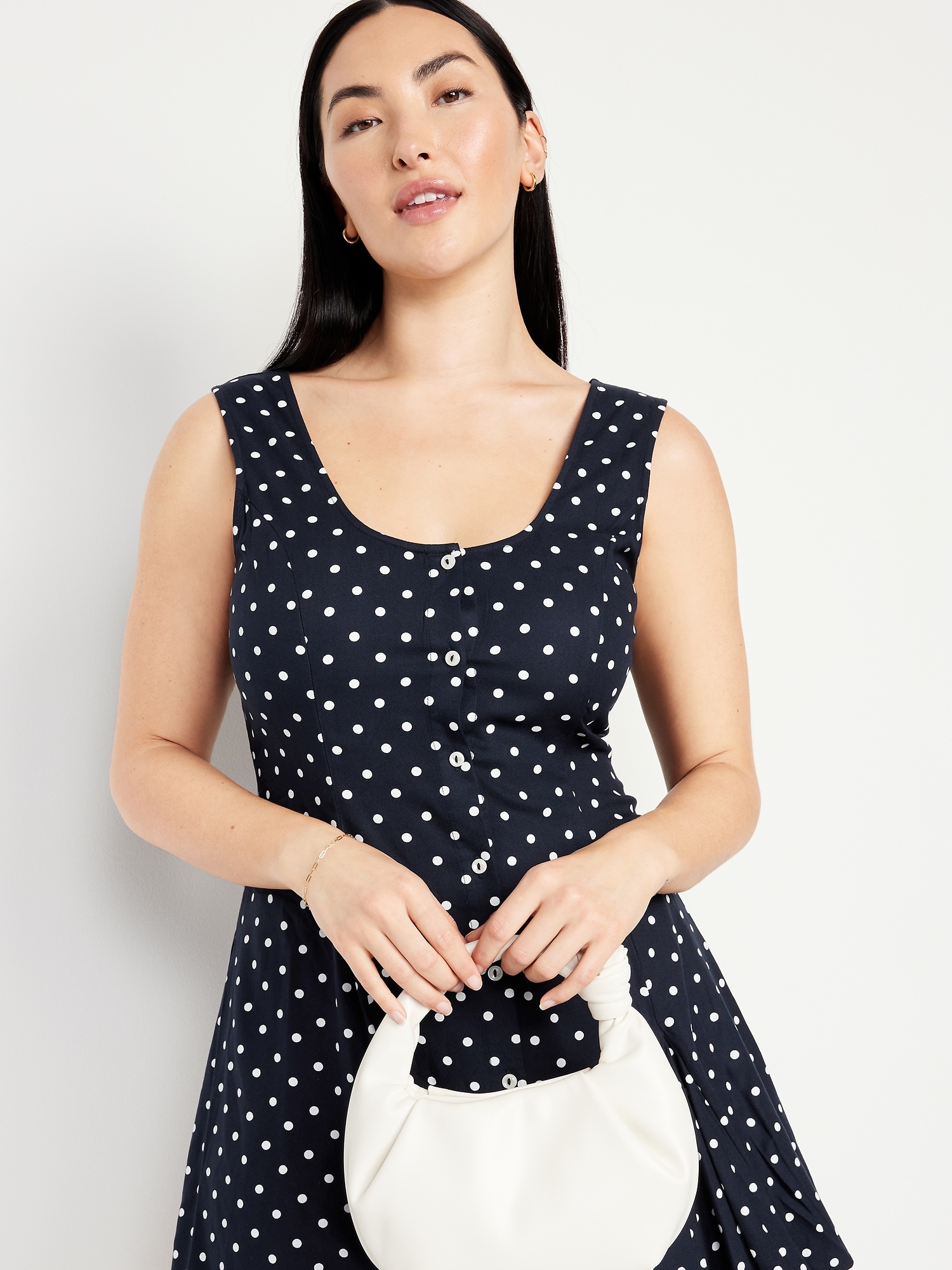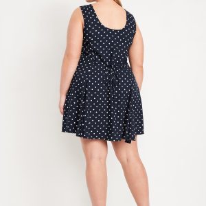 Fit & Flare Crepe Button-Front Mini Dress: scoop neck, wide straps, tie-back waist, full button front, princess seams, #798239