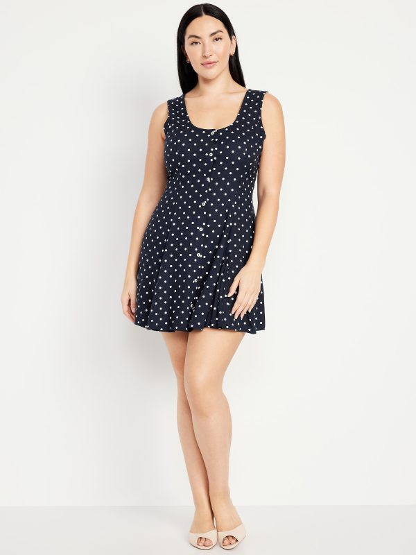 Fit & Flare Crepe Button-Front Mini Dress: scoop neck, wide straps, tie-back waist, full button front, princess seams, #798239