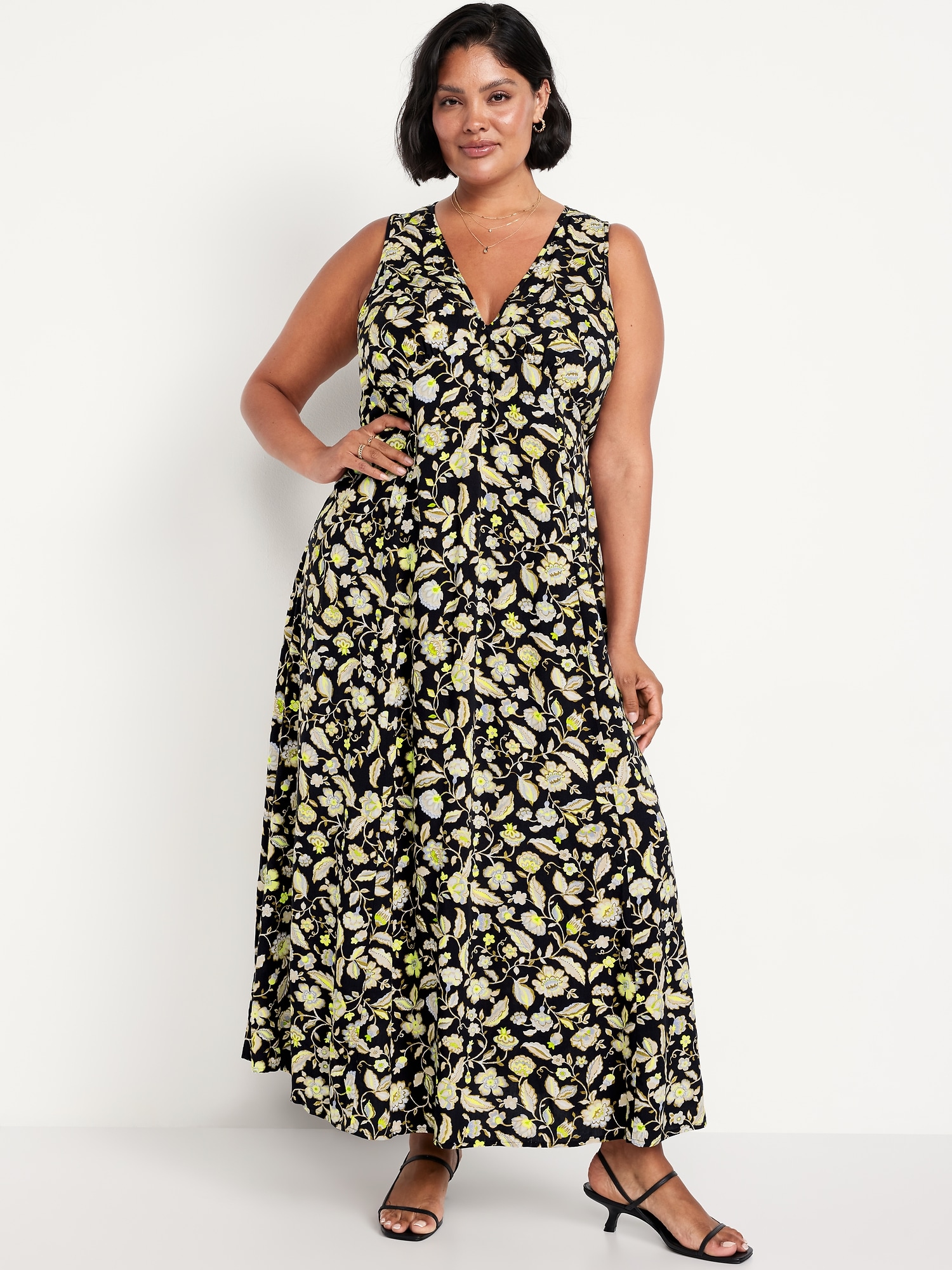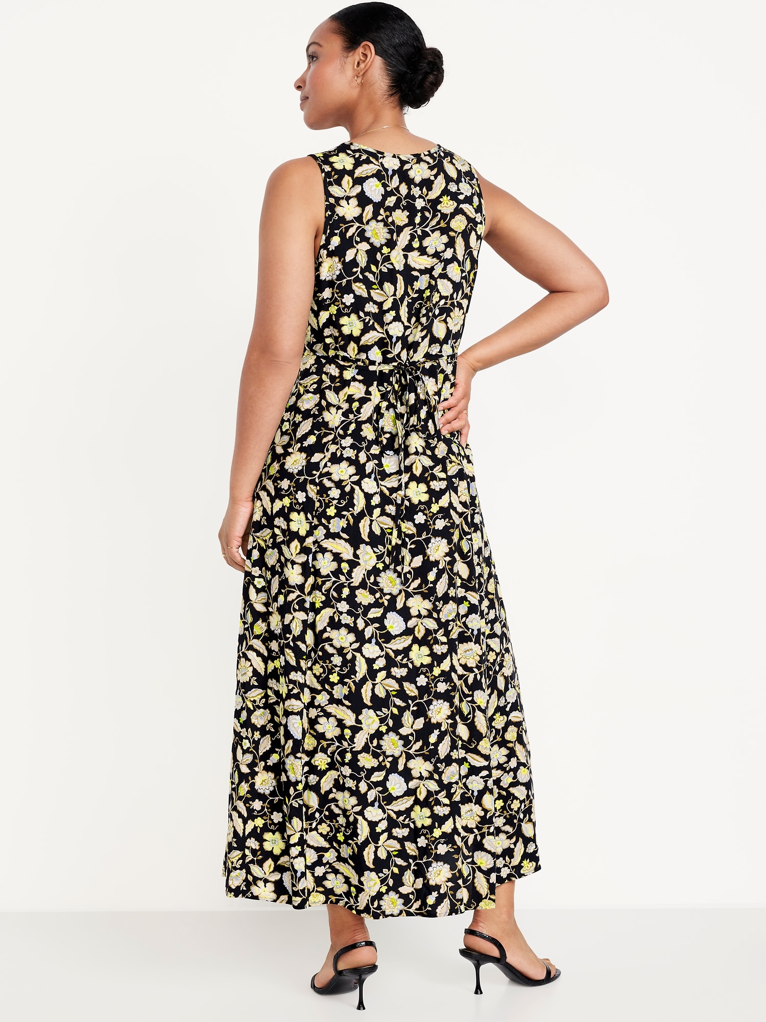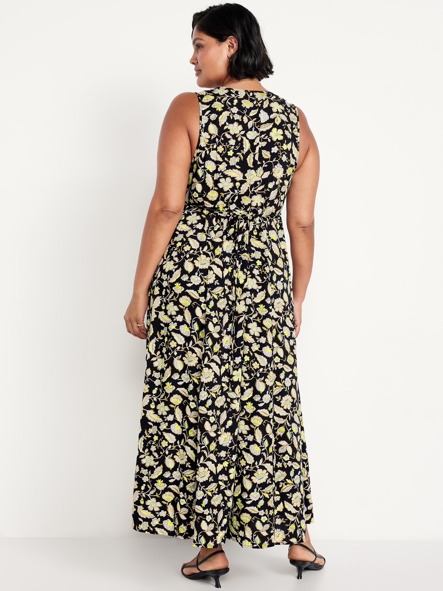 Fit & Flare Floral Maxi Dress: deep v-neck, sleeveless, tie-back waist, all-over floral print, #808837