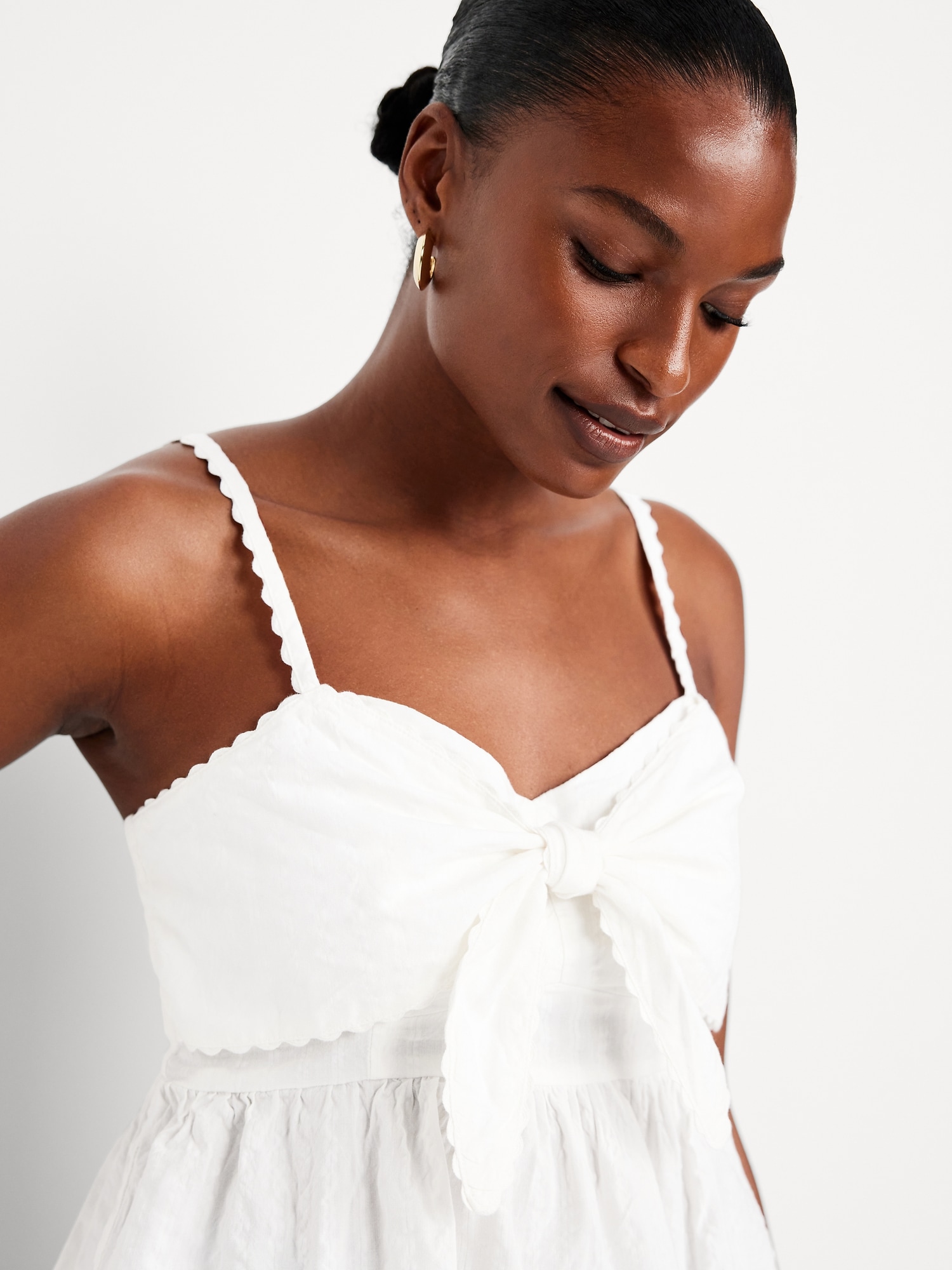 Fit & Flare Seersucker Peplum Top: knotted sweetheart neckline, adjustable straps, smocked back, peplum hem, floral and fruit print, #764190