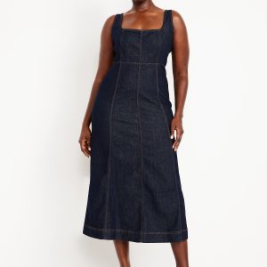 Fit & Flare Sleeveless Denim Midi Dress: square neck, wide straps, center back zipper, seamed skirt, #824527