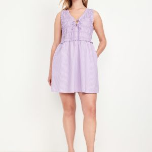 Fit & Flare Smocked Bodice Mini Dress: tie-front v-neck, wide ruffle-trim straps, smocked bodice, encased-elastic waist, on-seam pockets, shirred mini-length skirt, striped print, #766926