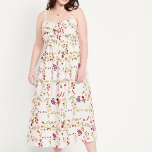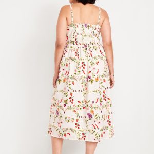 Fit & Flare Tie-Front Midi Dress: adjustable straps, knotted tie front, on-seam pockets, seamed shirred waist, smocked back, all-over fruit and floral print, #766927