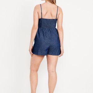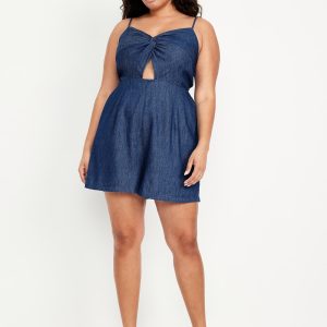 Fit & Flare Twist-Front Cami Romper: adjustable spaghetti straps, knotted keyhole front, on-seam pockets, smocked back, darted waist, #766930