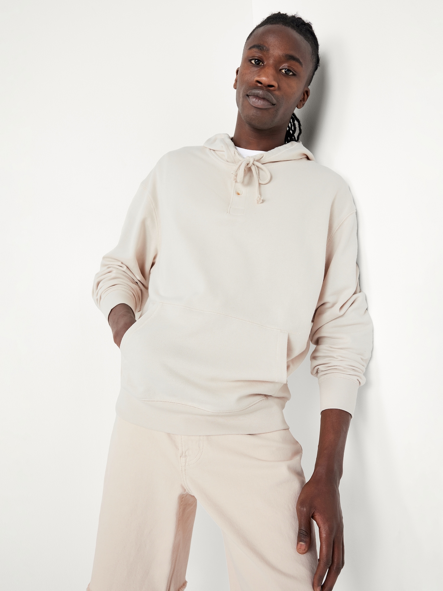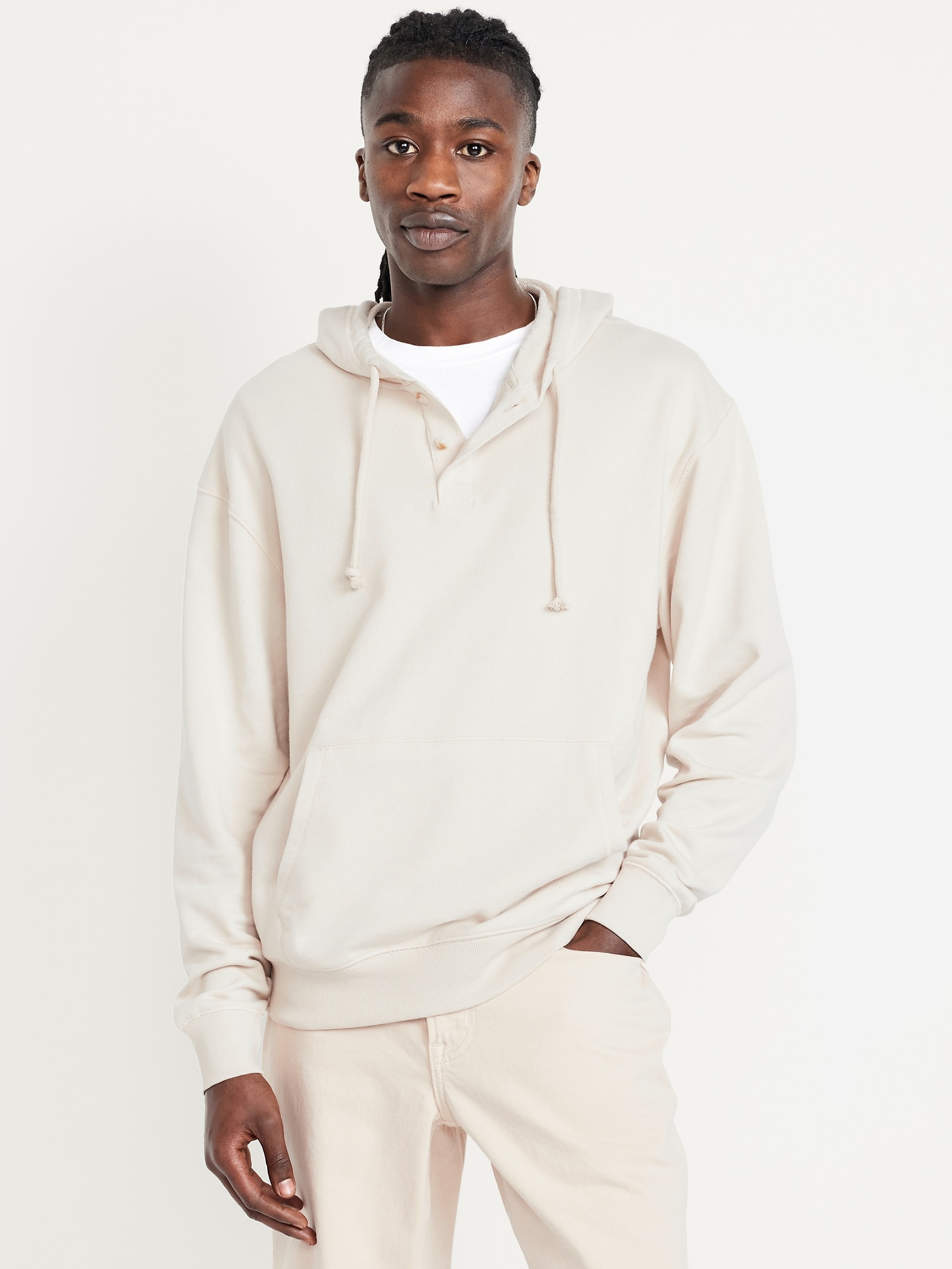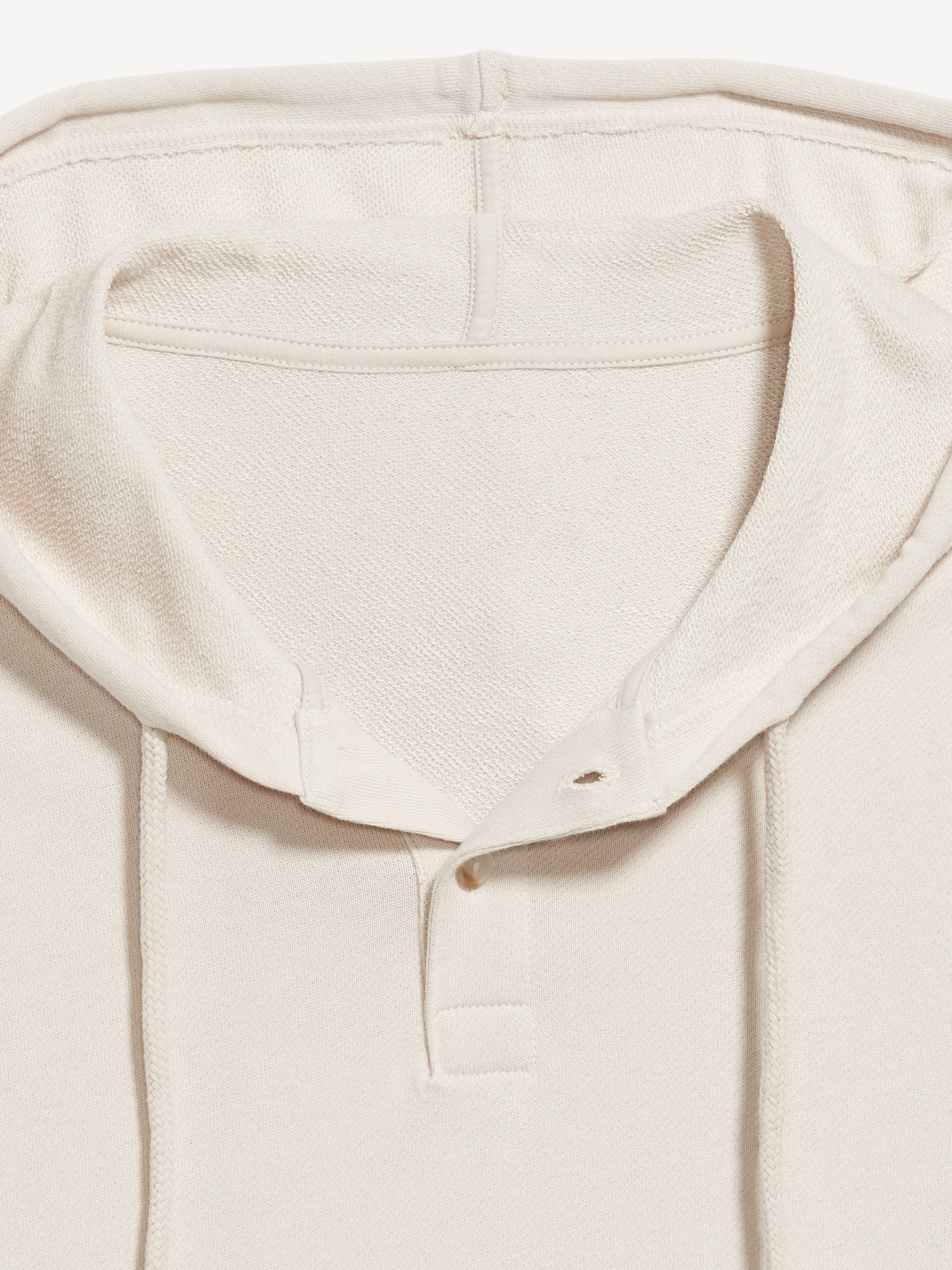 French Terry Pullover Hoodie: drawstring hood, long sleeves, henley-button placket, kangaroo pocket, rib-knit cuffs and hem, pullover style, #717405