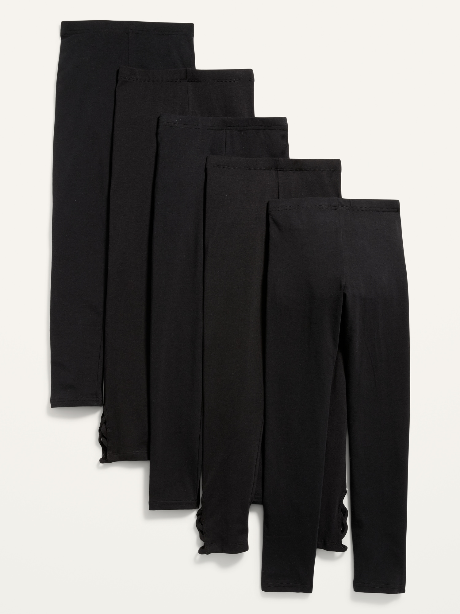 Full-Length Built-In Tough Leggings 5-Pack for Girls: Online exclusive!, Pack includes 5 pairs of leggings:, 3 pairs with regular hem., 2 pairs with lattice-hem detail., Elasticized waist., Soft-washed, lightweight jersey with comfortable stretch., Built-In Tough fabric has 2x the strength of regular leggings, which means they’re basically indestructible., Easy pull-on style., #842056