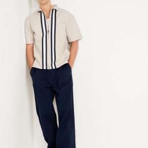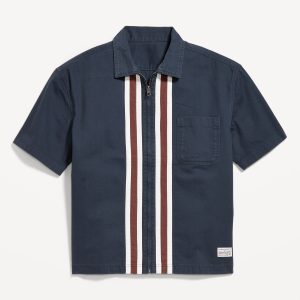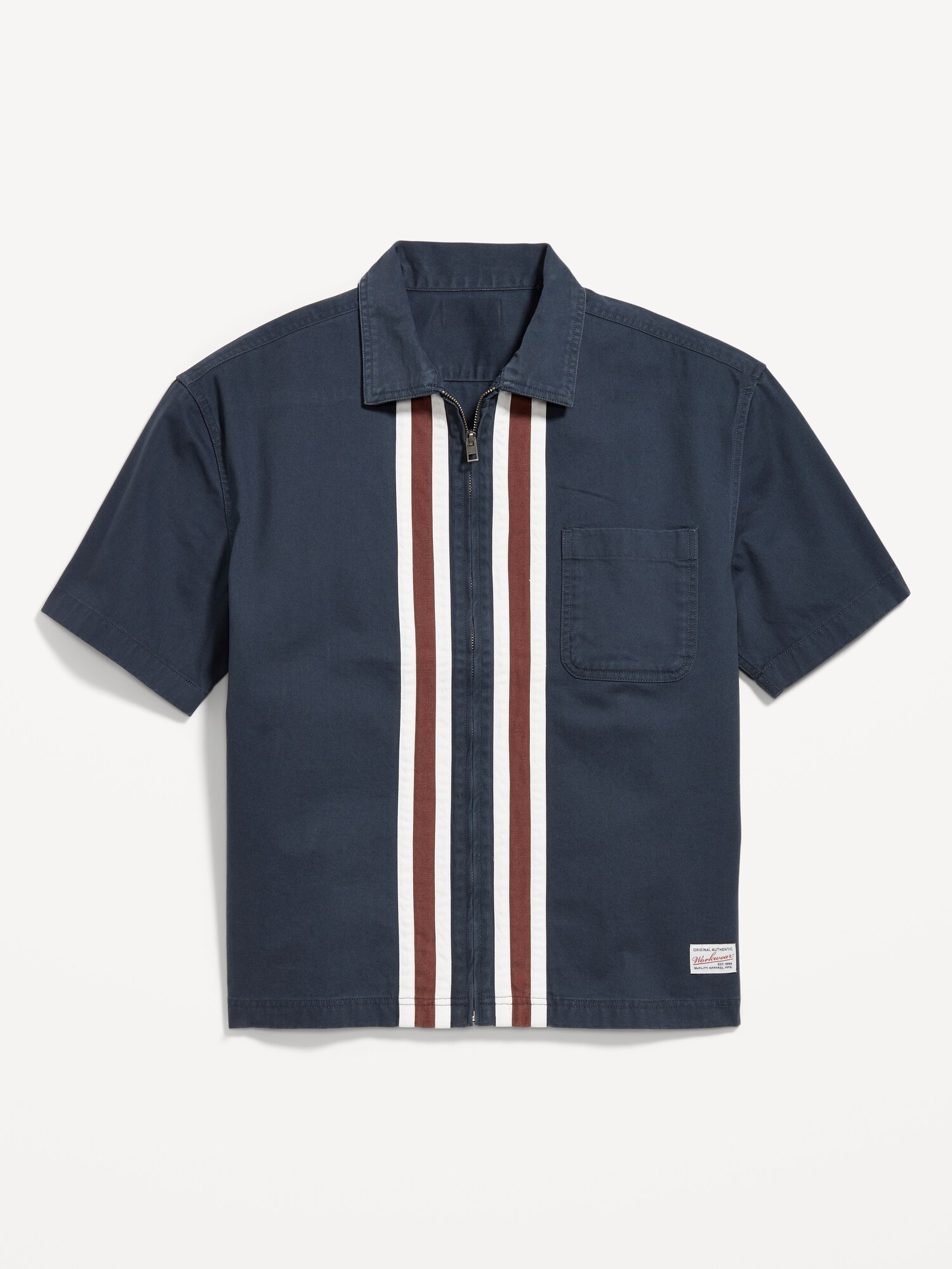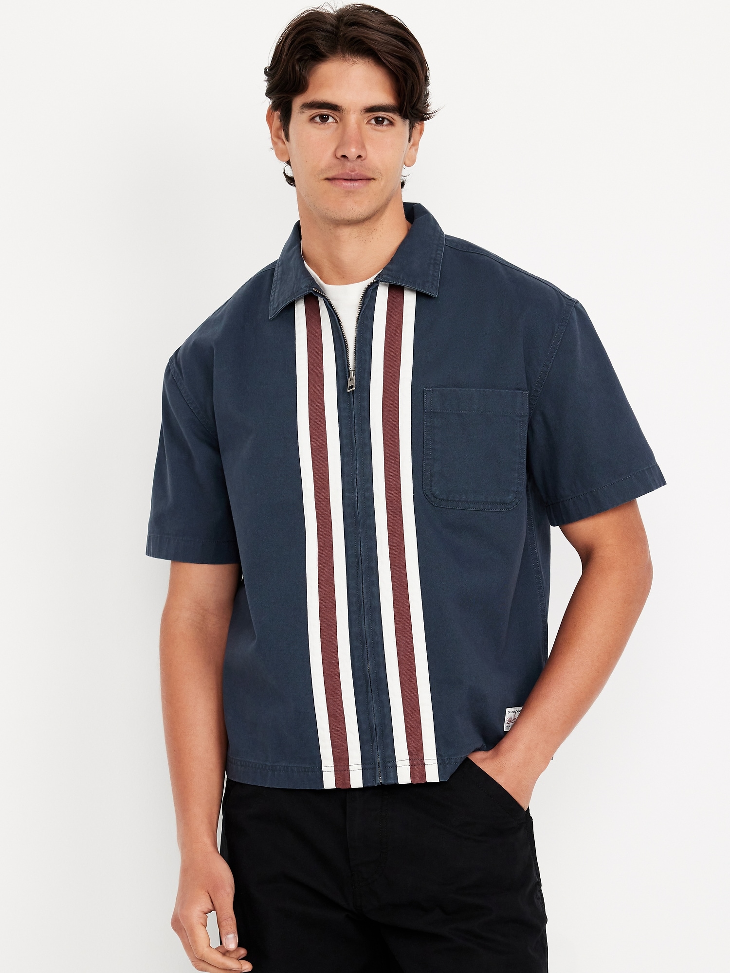 Full-Zip Moto Shirt: spread collar, short sleeves, zip front, patch chest pocket, contrasting stripes at center front, workwear patch at left hem, #778724