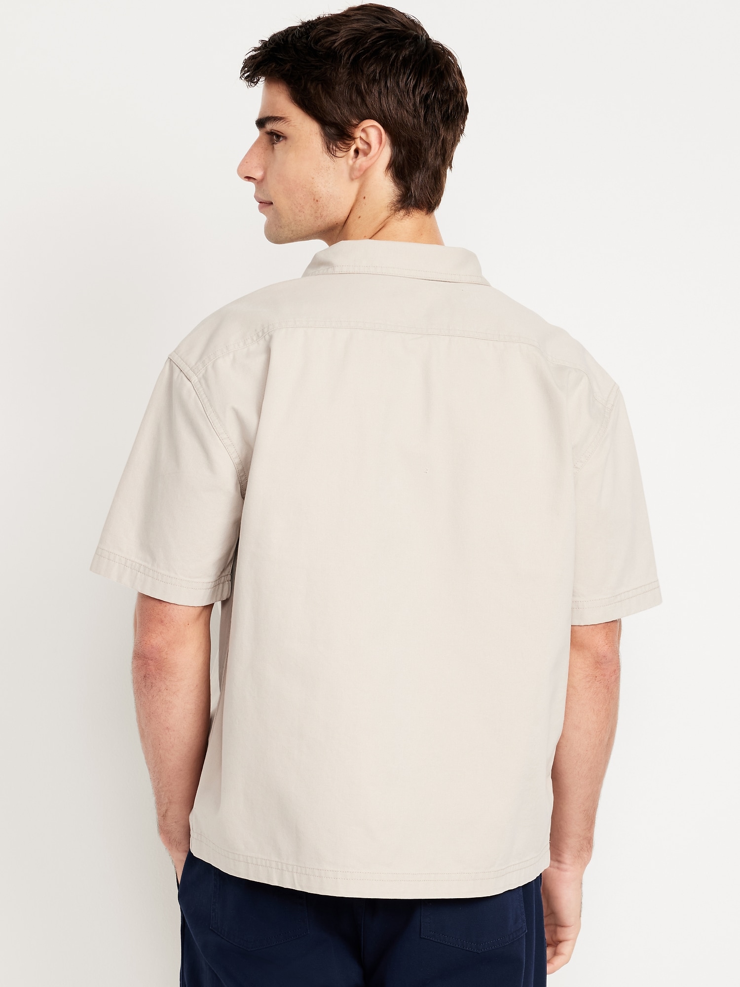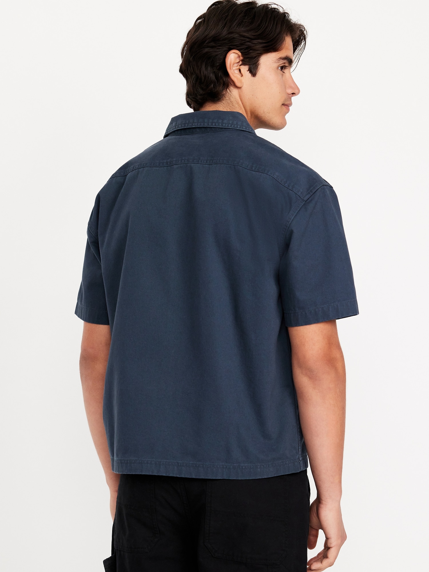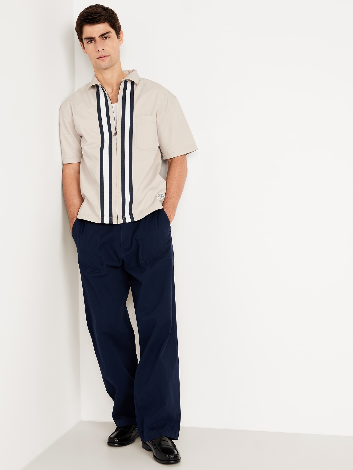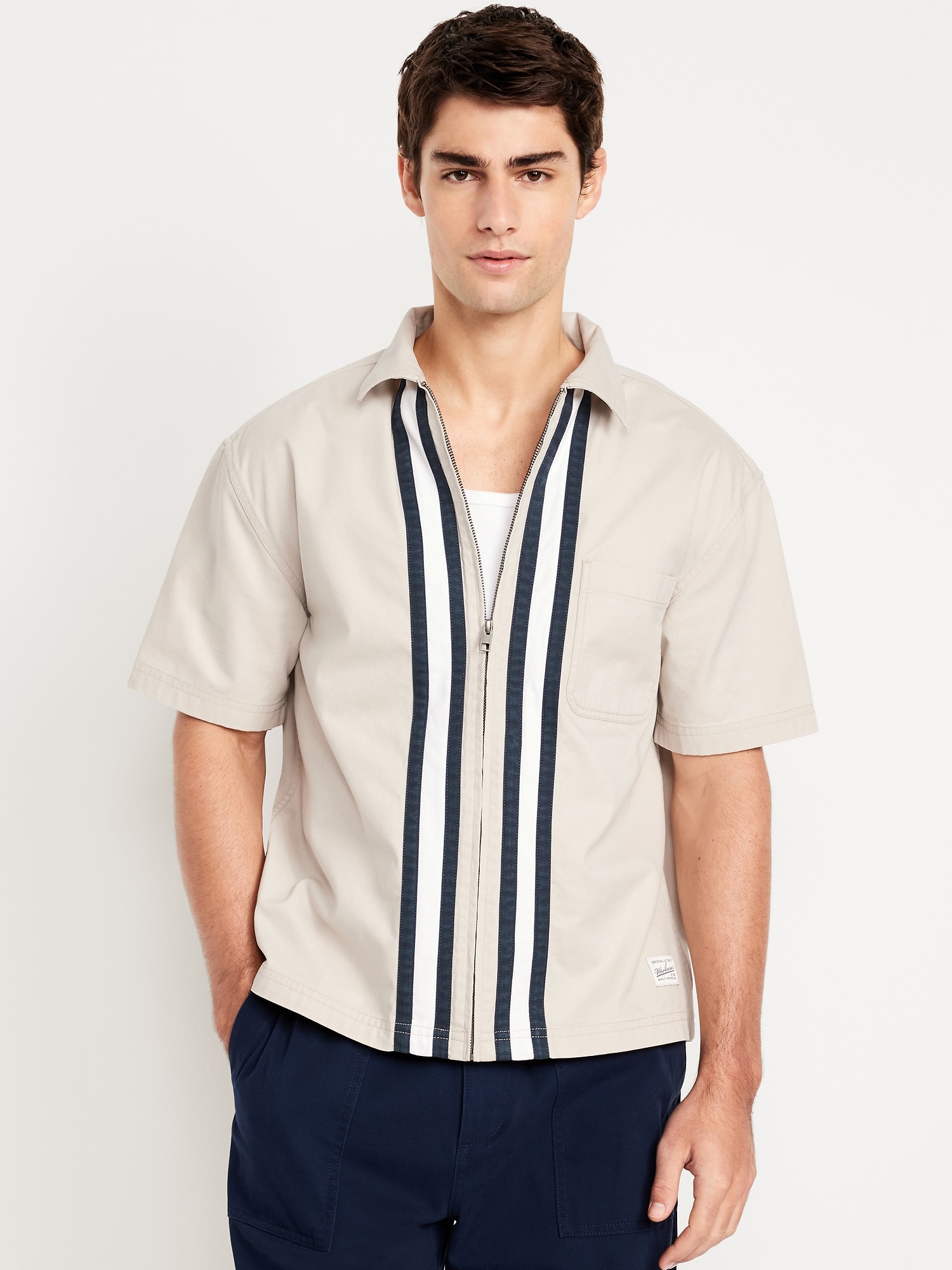 Full-Zip Moto Shirt: spread collar, short sleeves, zip front, patch chest pocket, contrasting stripes at center front, workwear patch at left hem, #778724
