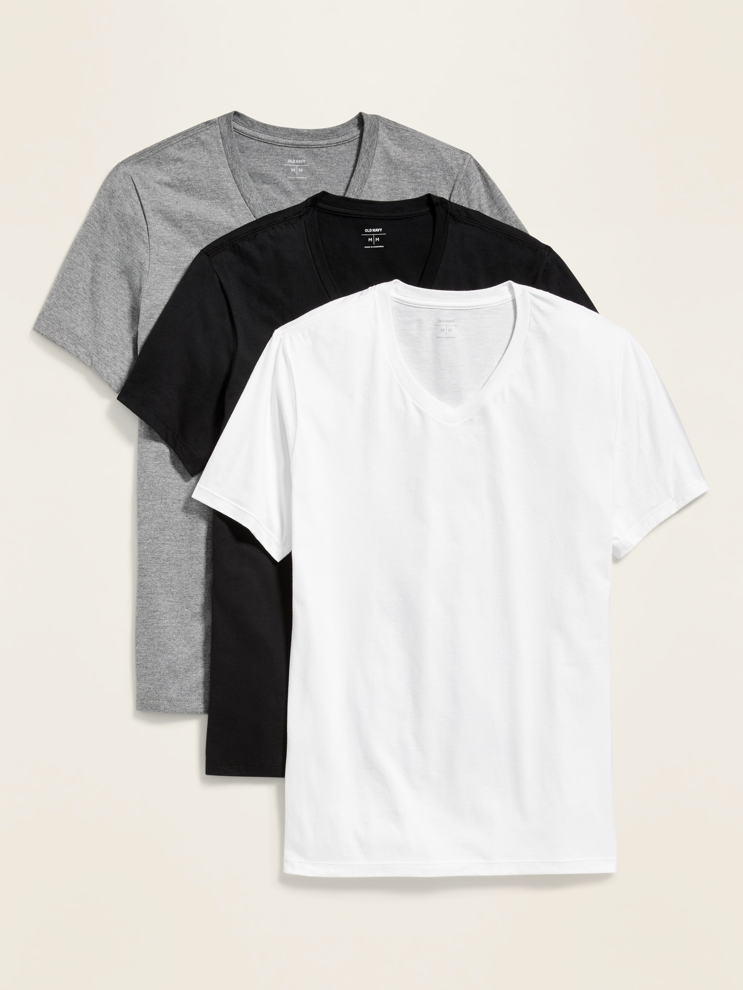 Go-Dry V-Neck T-Shirt 3-Pack: Set includes three tees., Rib-knit V-neck., Short sleeves., Go-Dry moisture-wicking technology keeps you dry & comfortable., Soft-washed, lightweight jersey for the ultimate in softness. We put it through the wringer so you don’t have to., White/Black/Heather Gray only: 100% cotton (black & white colors only); 60% cotton, 40% polyester (heather gray color only)., Tag-free label and pieced trim inside neck for added comfort & durability., #209759