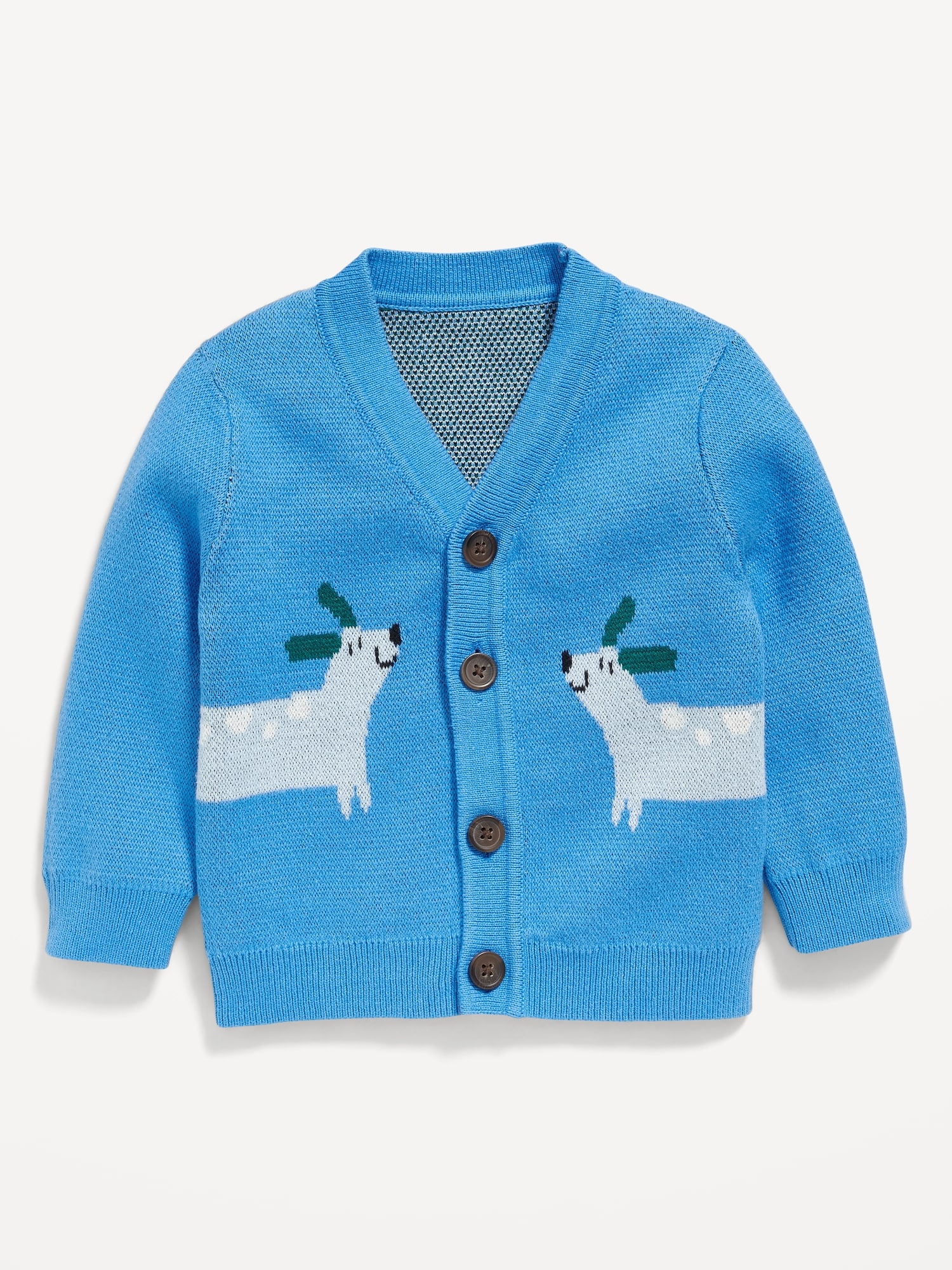 Graphic Cardigan Sweater for Baby: v neck, long sleeves, drop shoulders, four-button placket, pockets at hem, color block, #789184