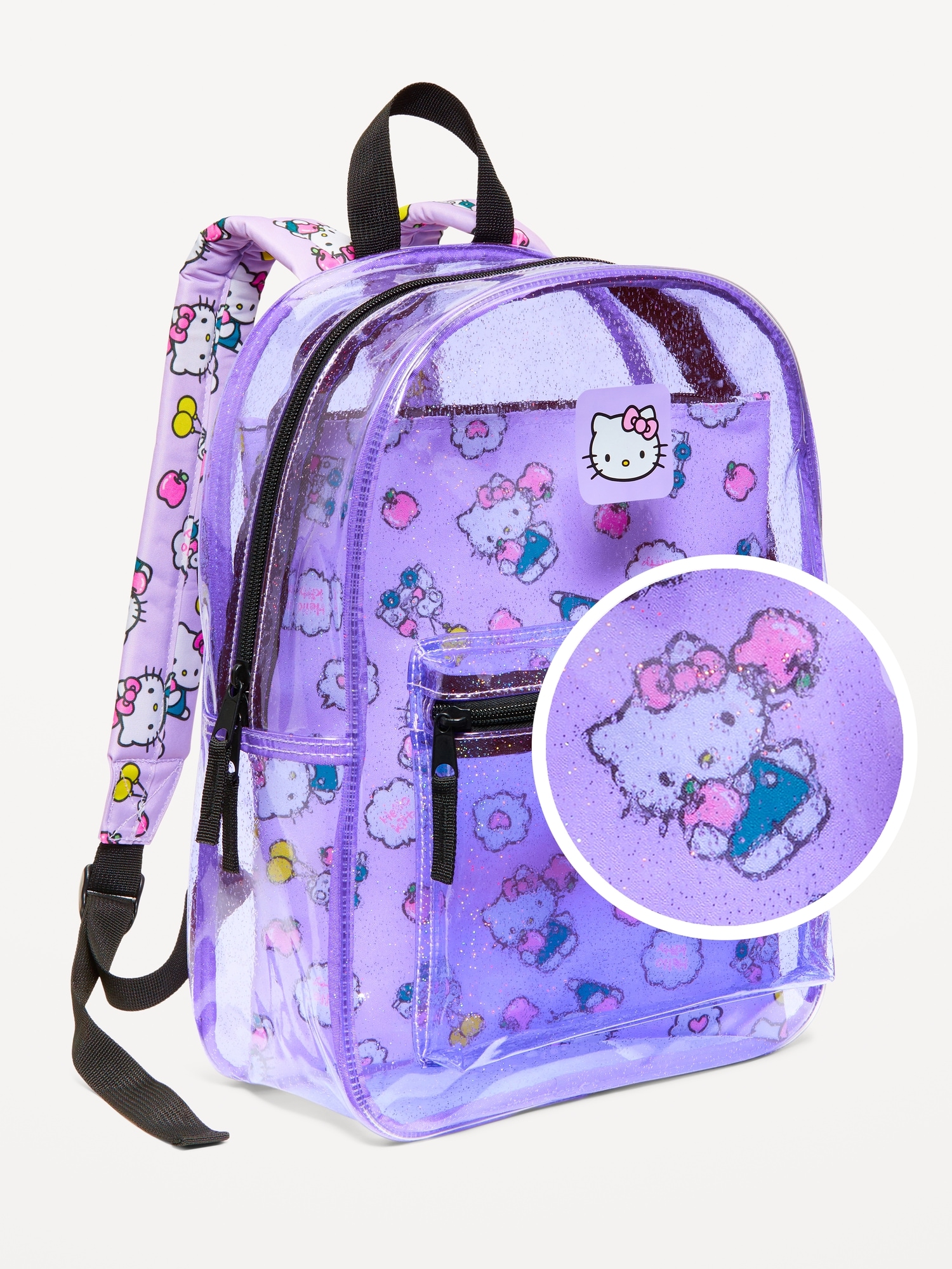 Hello Kitty® Clear Backpack for Girls: The pack that’s got their literal back.zip-top closure, canvas handle, padded shoulder straps with adjustable buckles, exterior zippered pouch compartment, removable interior sleeve compartment, © 2025 SANRIO CO. LTD. Used Under License., #762668