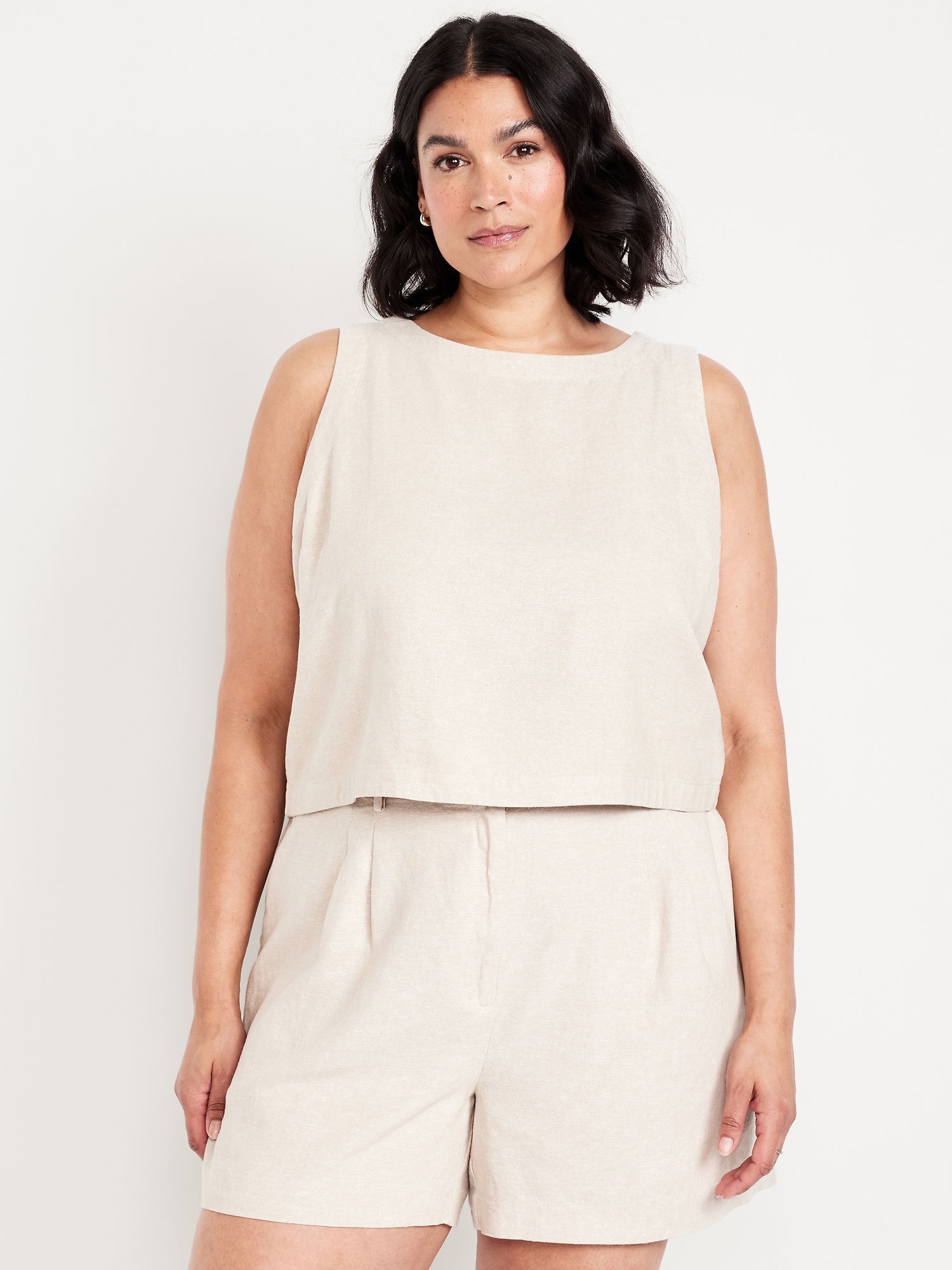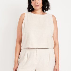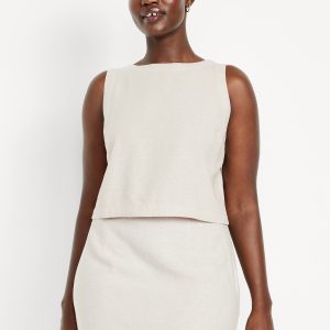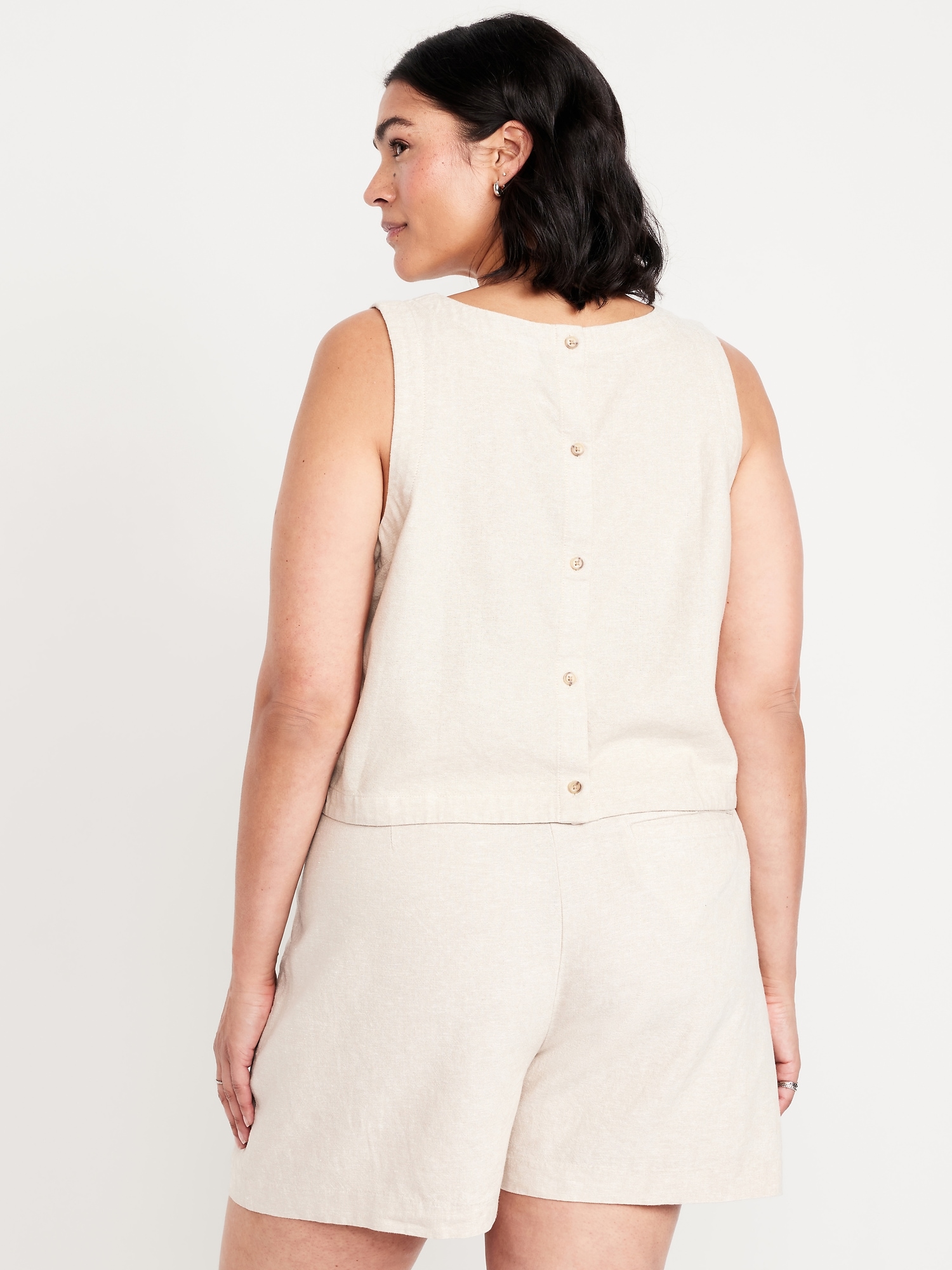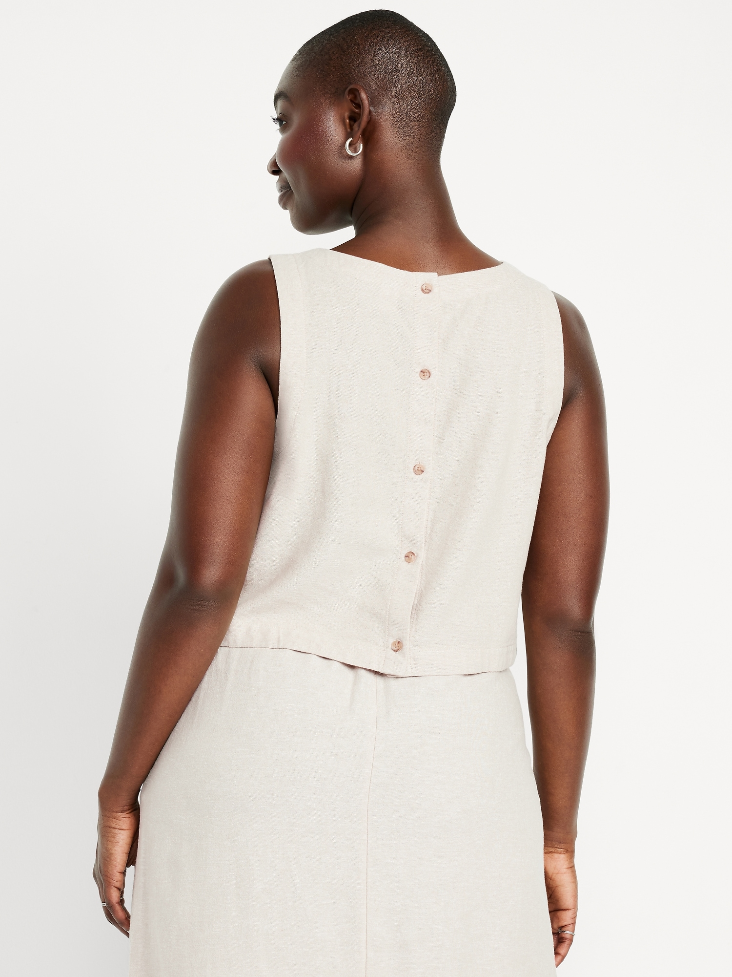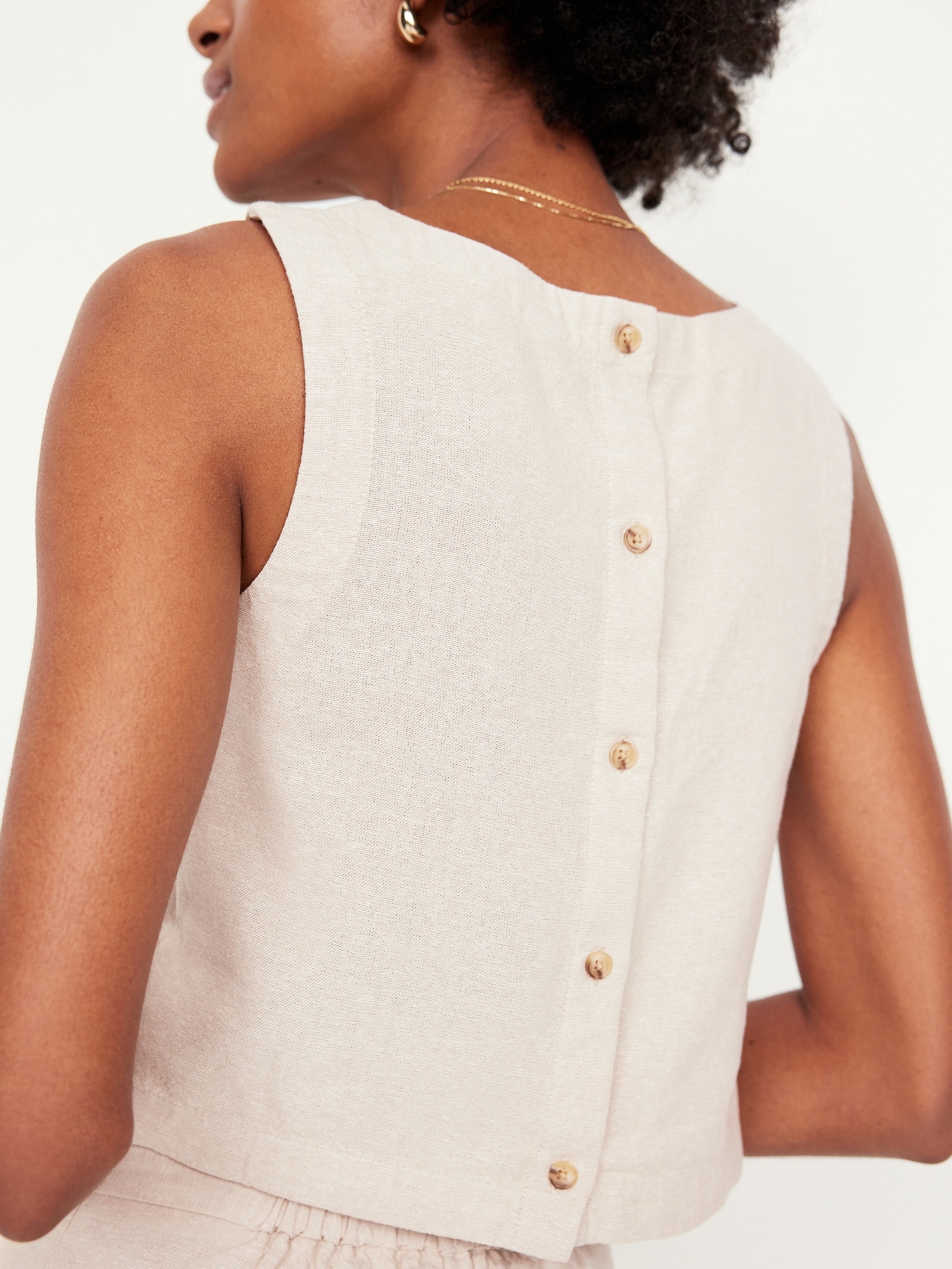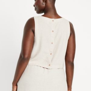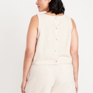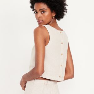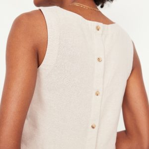 Hi-Neck Button-Back Linen-Blend Top: high neck, sleeveless, button back, #756729