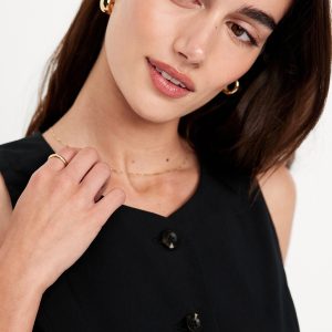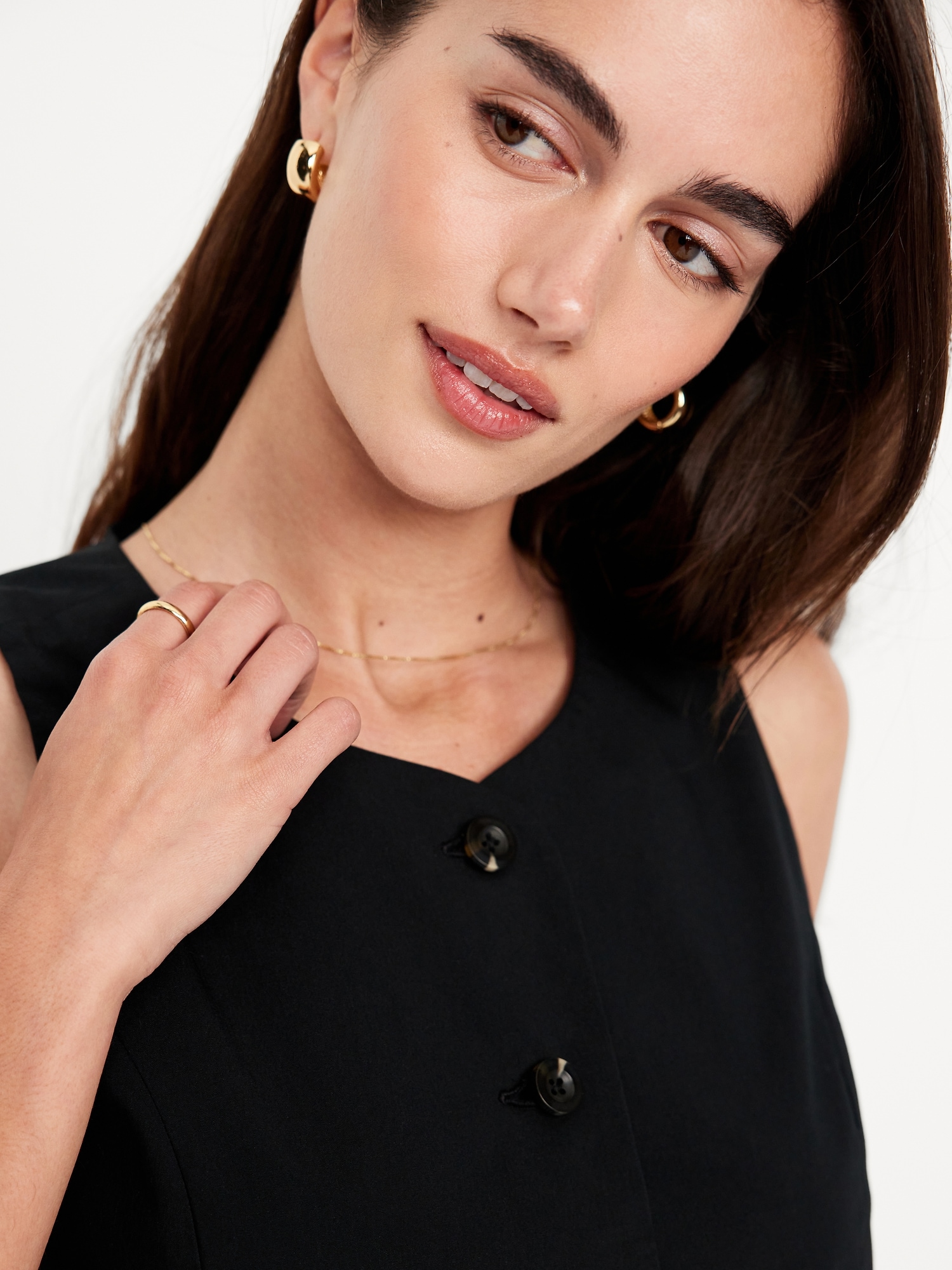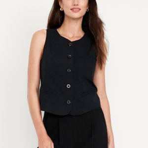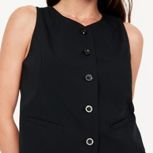 High-Neck Button-Down Vest: high neck, sleeveless, full-button front, welt pockets, princess seams, #693727