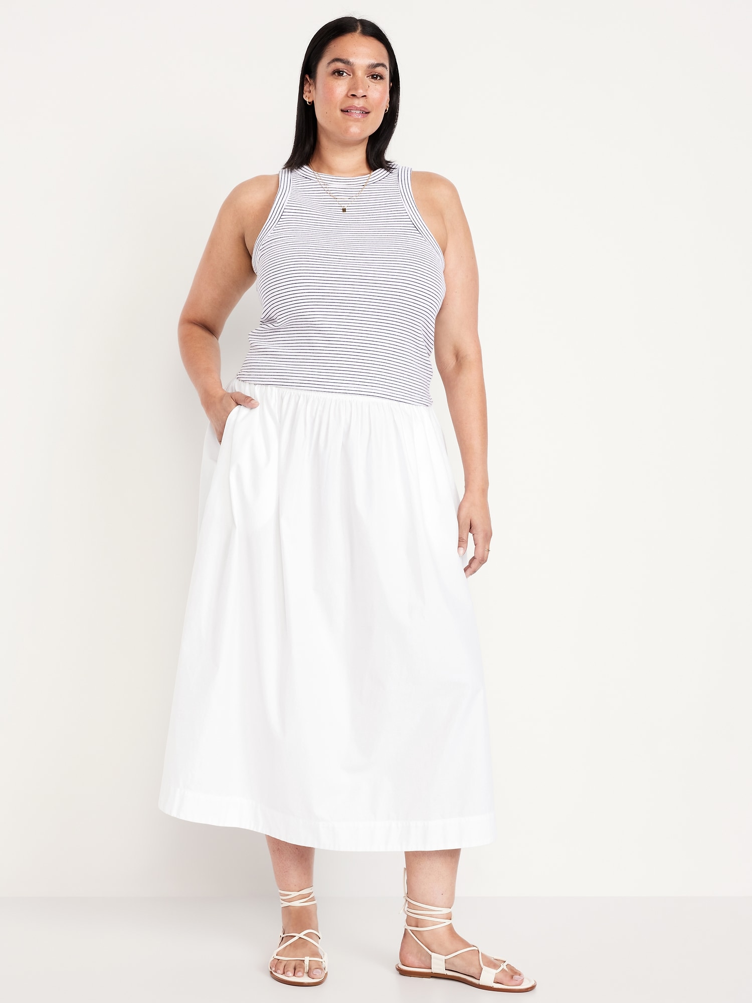 High-Waisted A-Line Midi Skirt: high elasticized waistband, side-seam pockets, striped print, #766934