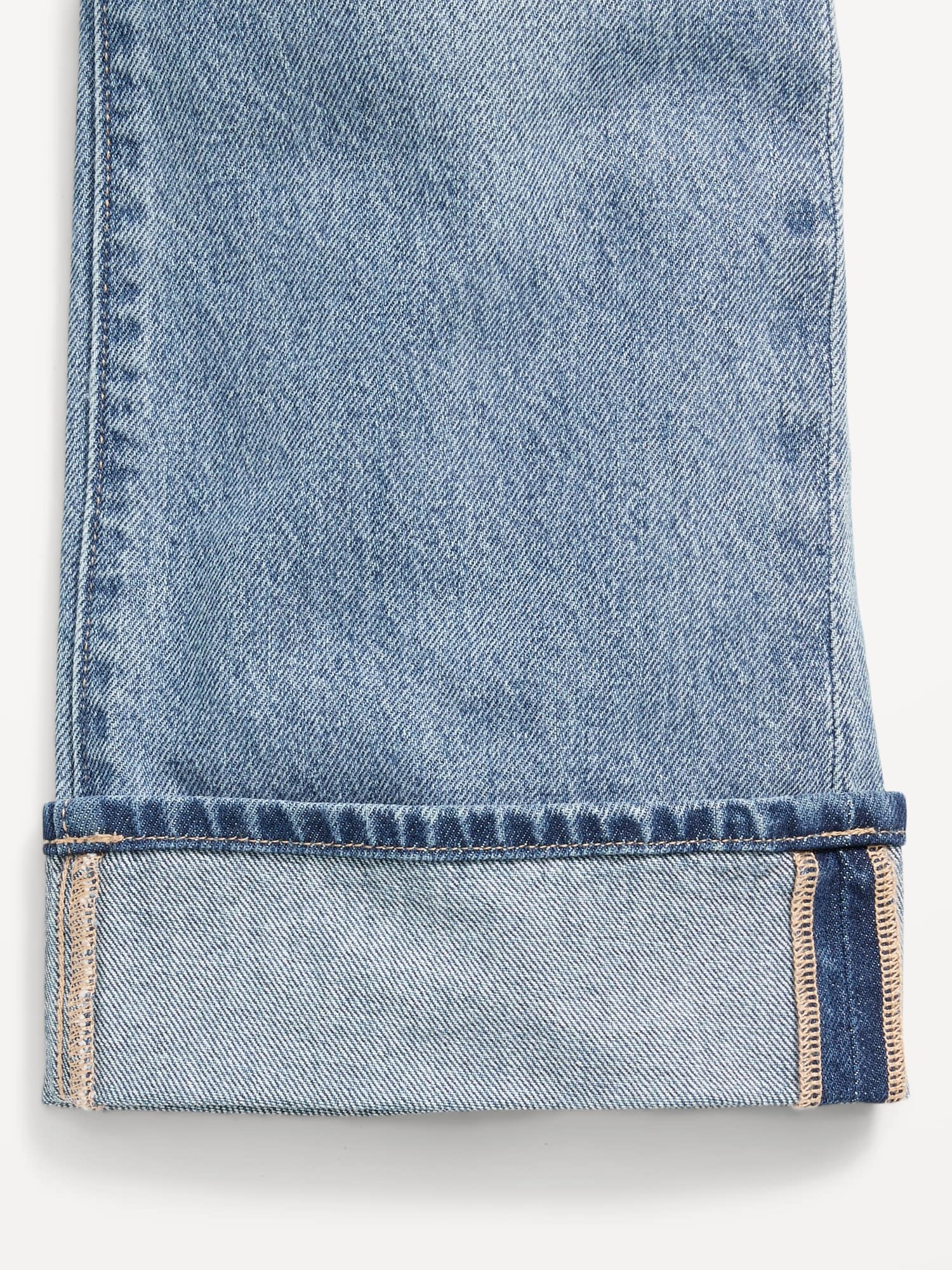 High-Waisted Baggy Wide-Leg Jeans for Girls: interior adjustable waistband, snap button closure (sizes 5-8), regular button closure (sizes 10-20), zip fly, scoop pockets and coin pocket, patch pockets at back, wide leg opening, rolled cuff, #767083