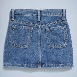 High-Waisted Button-Front Jean Skirt for Toddler Girls: interior adjustable waistband, four snap-button closure, patch pockets at front, patch pockets at back, asymmetrical center seam at front, #694489