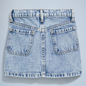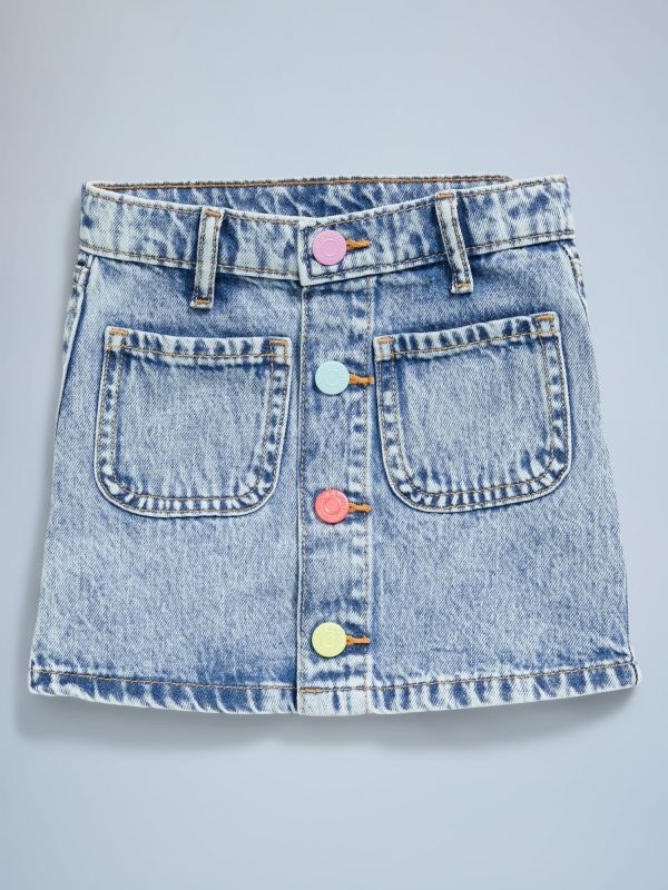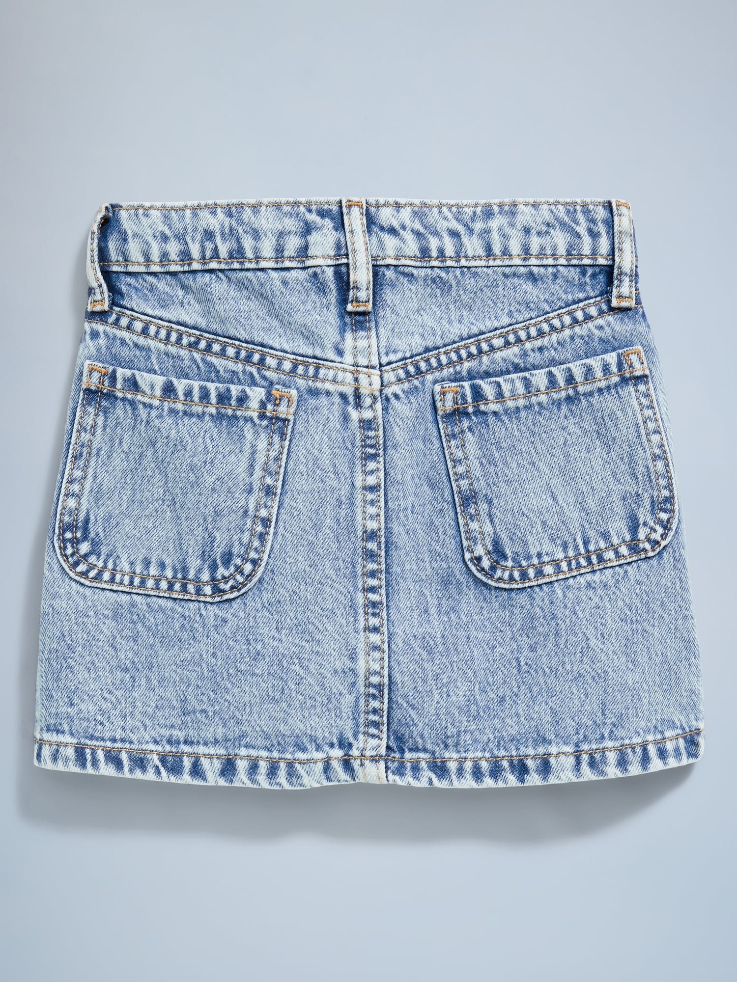 High-Waisted Button-Front Jean Skirt for Toddler Girls: interior adjustable waistband, four snap-button closure, patch pockets at front, patch pockets at back, asymmetrical center seam at front, #694489