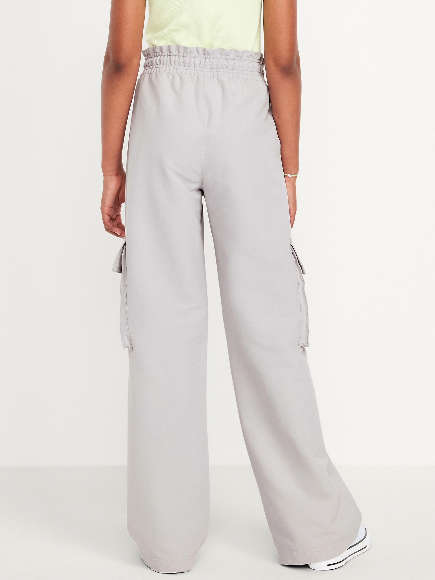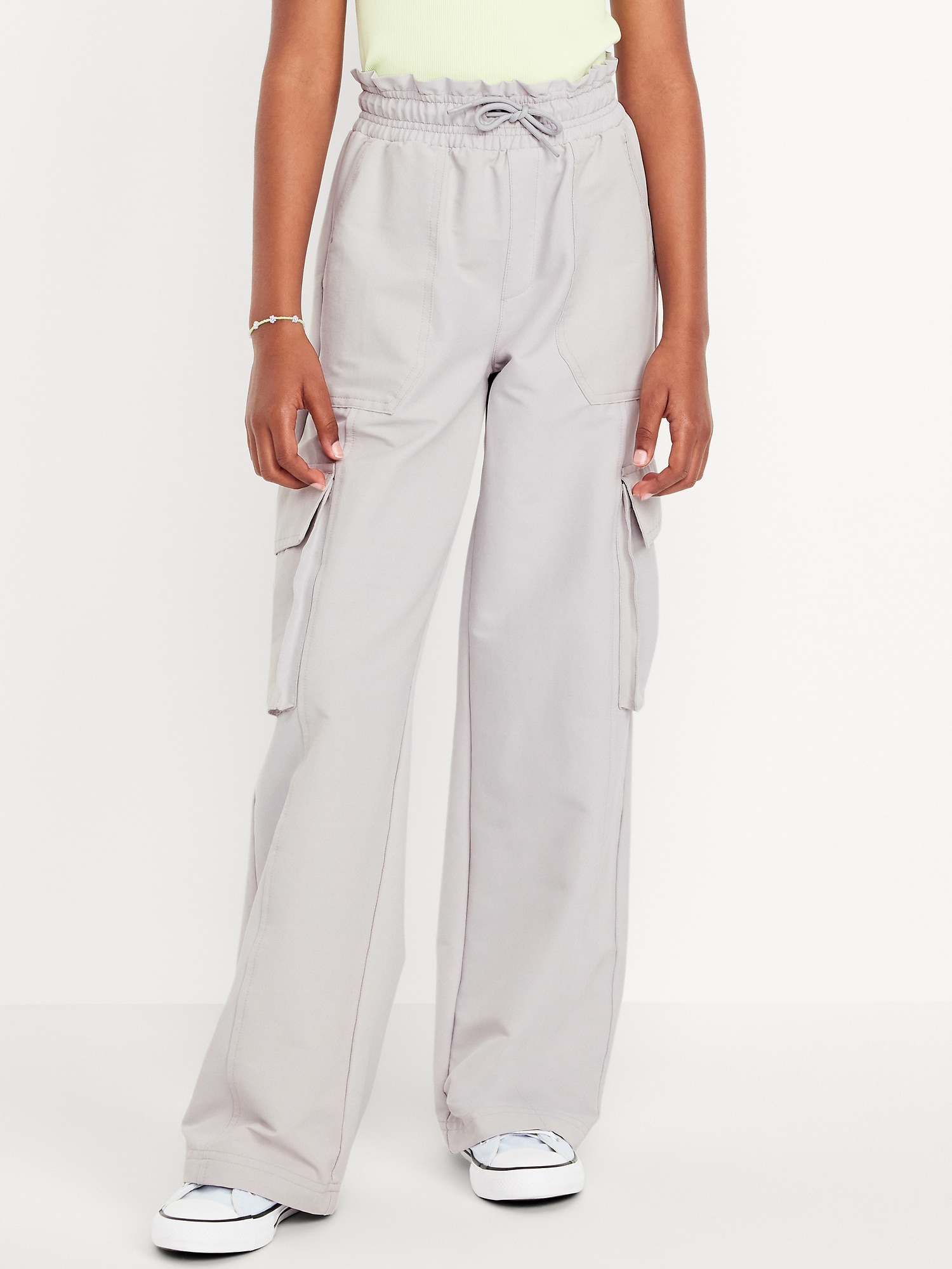 High-Waisted Cargo Wide-Leg Performance Pants for Girls: high rise, elasticized ruffled waistband, functional drawstring, diagonal on-seam pocket, flap cargo pockets, wide leg, #802737