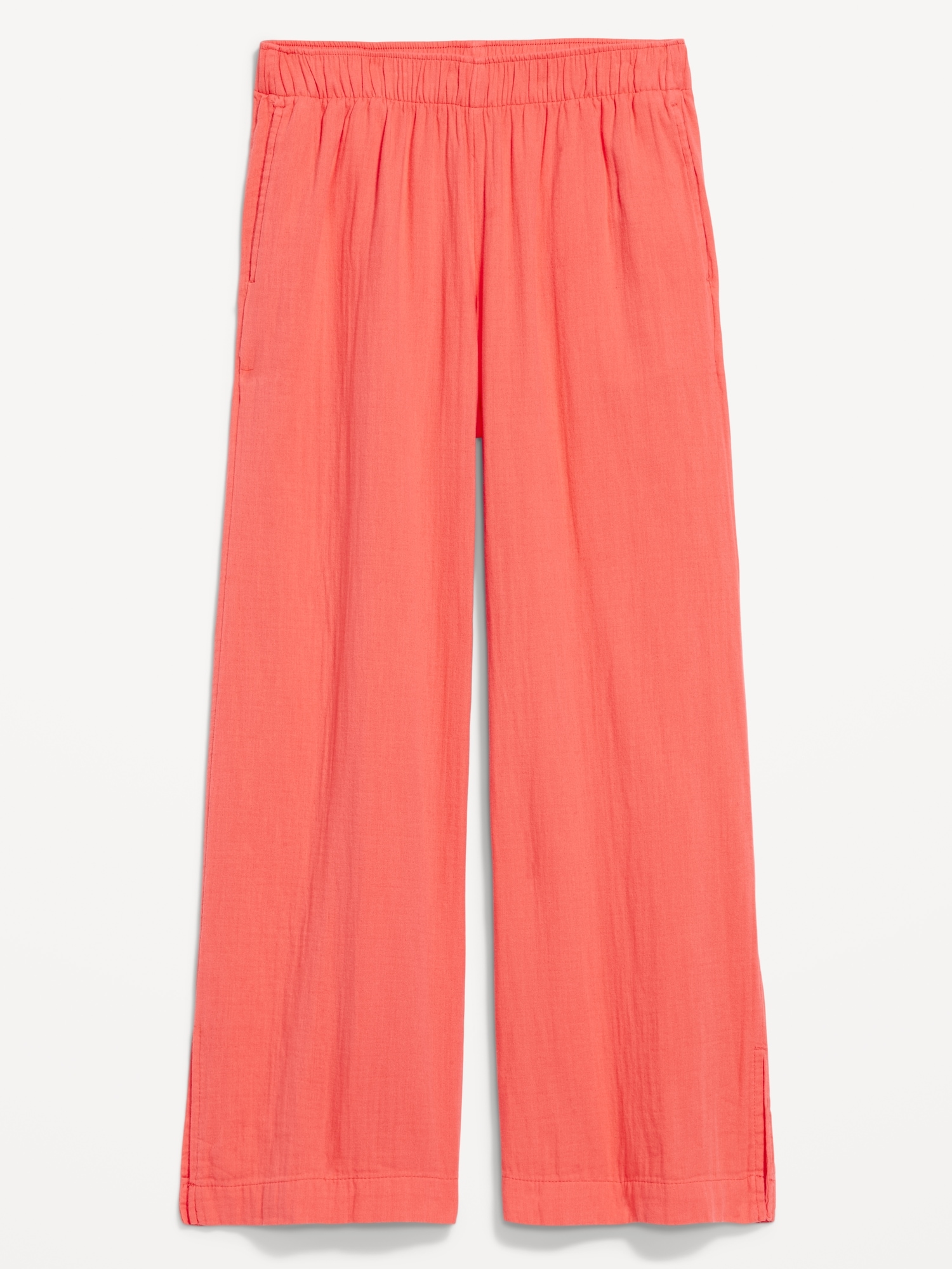 High-Waisted Crinkle Gauze Super Wide-Leg Pants: A light, rippled fabric that’s begging to be beachside.comfort-elastic high pull-on waistband, on-seam pockets, super wide leg, striped print, #683359