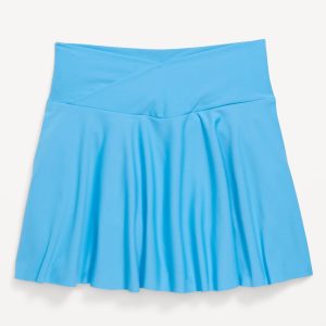 High-Waisted Crossover PowerSoft Skort for Girls: built-in biker shorts, high-rise, crossover elasticized waistband, mini-length skirt, side pocket on shorts, easy pull-on style, #696570