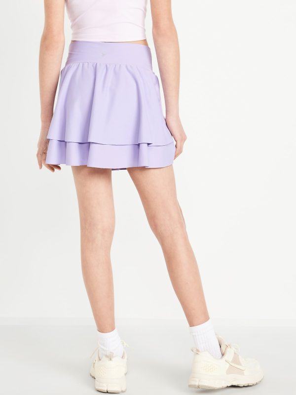 High-Waisted Crossover PowerSoft Skort for Girls: built-in biker shorts, high-rise, crossover elasticized waistband, mini-length skirt, side pocket on shorts, easy pull-on style, #696570
