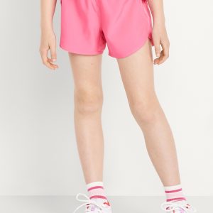 High-Waisted Dolphin-Hem Run Shorts for Girls: elasticized waistband, seamed back yoke, integrated built-in brief liner, vented dolphin hem, light-reflecting old navy active logo at left hem, #696568