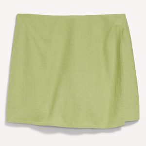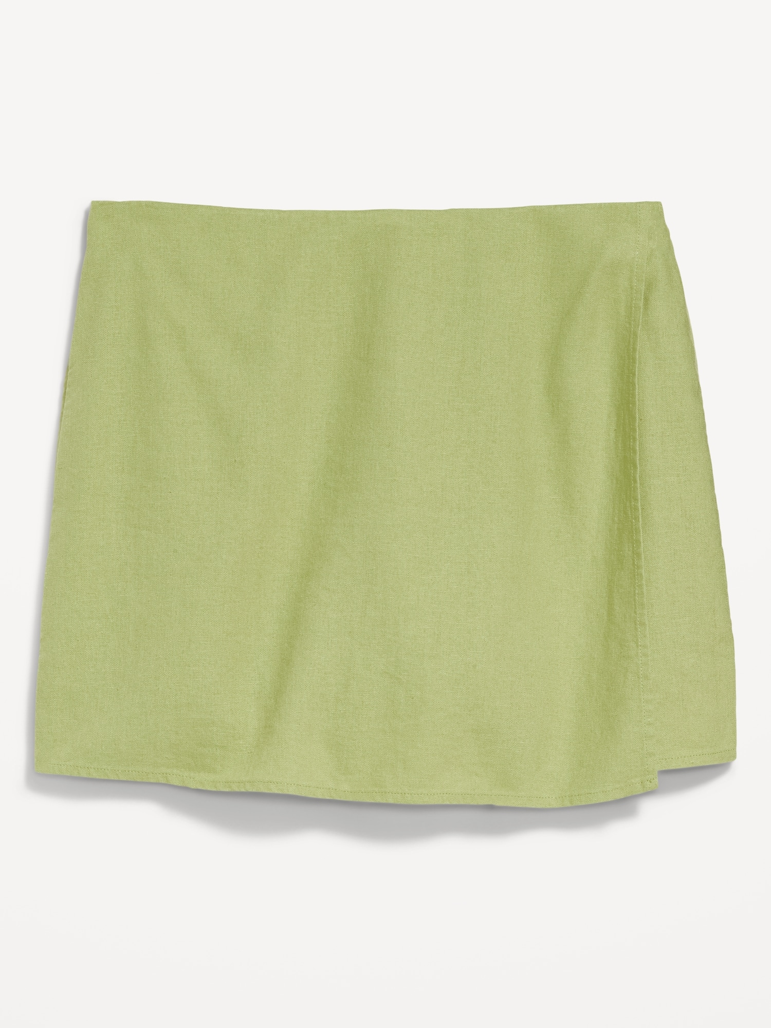 High-Waisted Faux-Wrap Linen-Blend Mini Skort: faux-wrap front, elastic back waist, built-in shorts, #766917