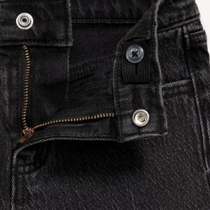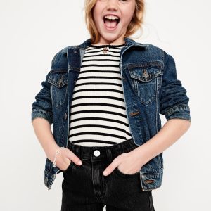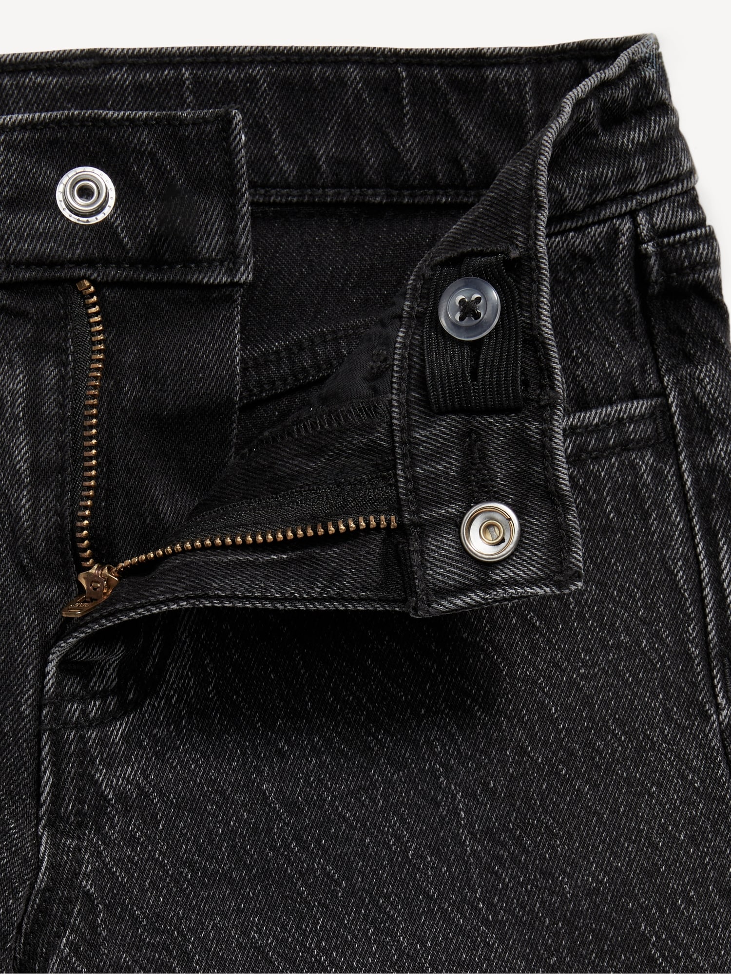 High-Waisted Jean Midi Shorts for Girls: interior adjustable waistband, sizes 5-8 snap-button closure, sizes 10-20 regular button closure, exposed button fly, patch pockets at front, patch pockets in back, #767091