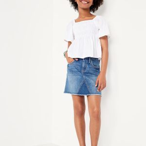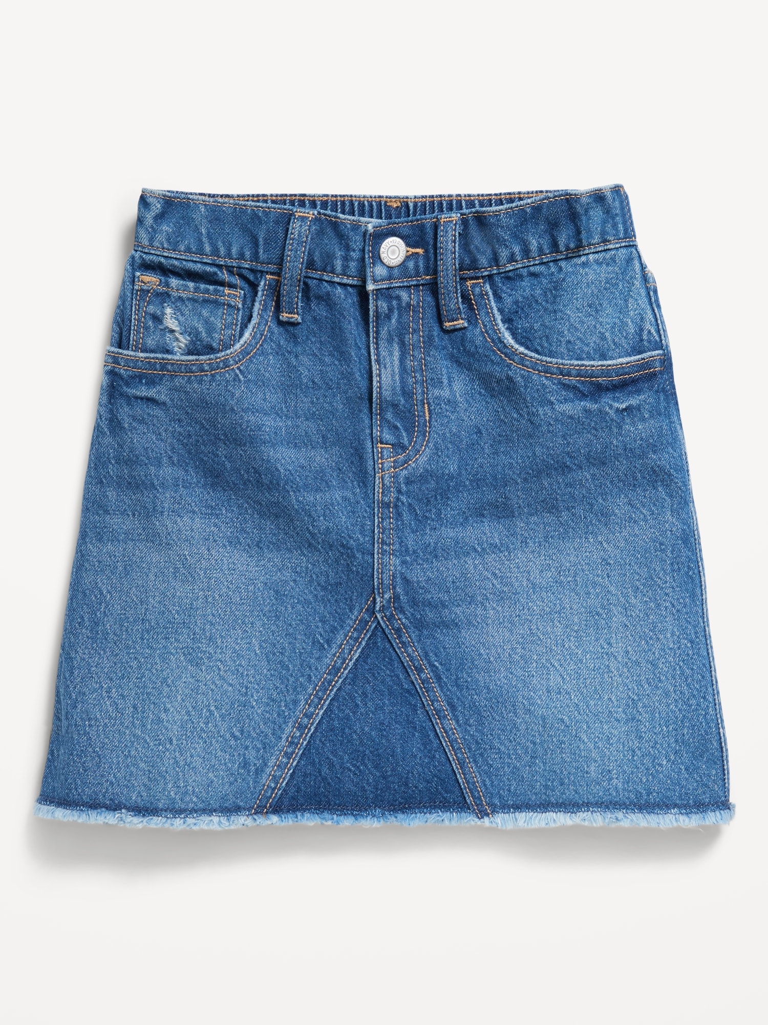 High-Waisted Jean Skirt for Girls: interior adjustable waistband, snap-button closure in sizes 5-8, regular button closure in sizes 10-20, zip fly, asymmetrical center seam at front, scoop pockets and coin pocket in front, patch pockets in back, #766666
