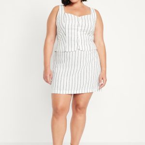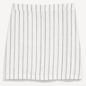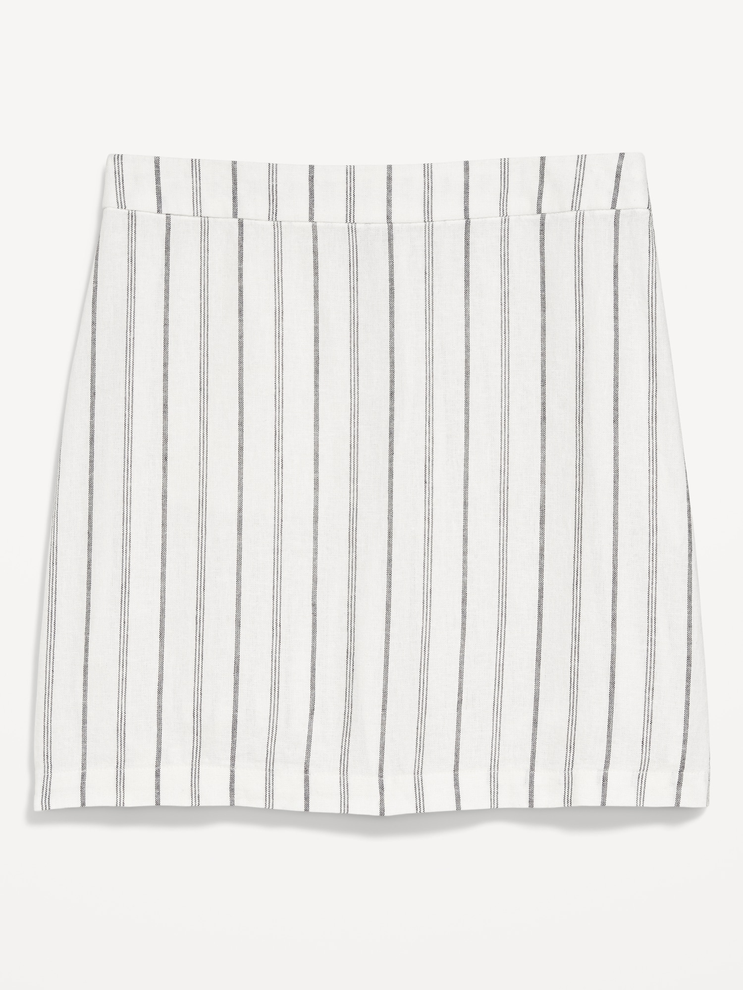 High-Waisted Linen-Blend Mini Skirt: elasticized back waist, hidden left seam zipper, back right welt pocket, pull-on style, vertical striped print, #705375