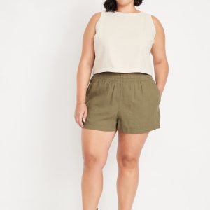 High-Waisted Linen-Blend Shorts — 3.5-inch inseam: comfort elastic waistband, on-seam hip pockets, back patch pockets, easy pull-on style, #693453