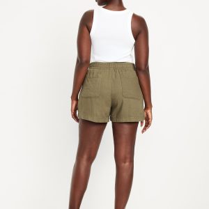 High-Waisted Linen-Blend Shorts — 3.5-inch inseam: comfort elastic waistband, on-seam hip pockets, back patch pockets, easy pull-on style, #693453