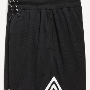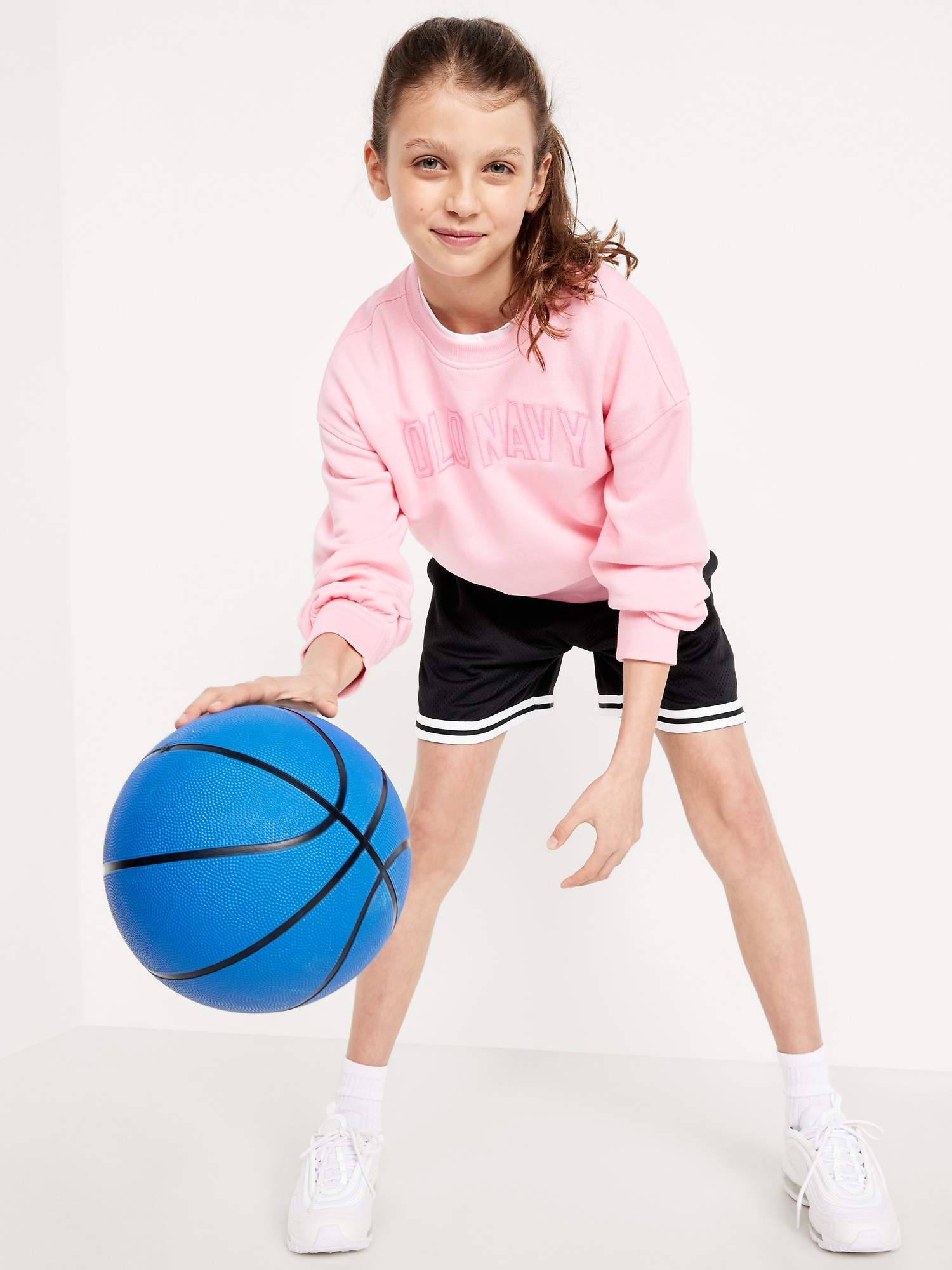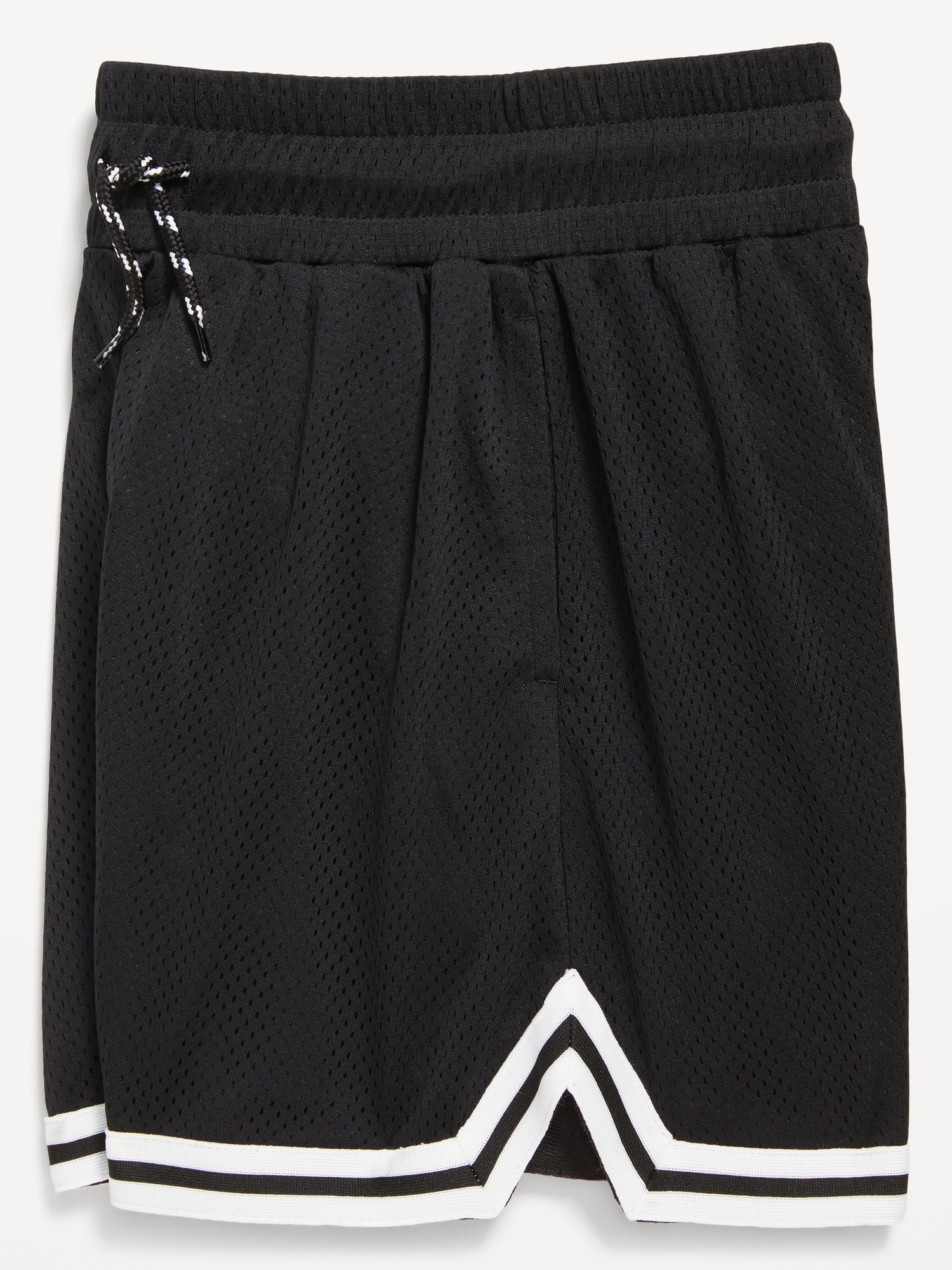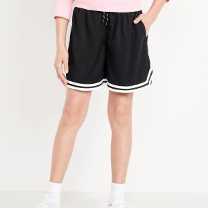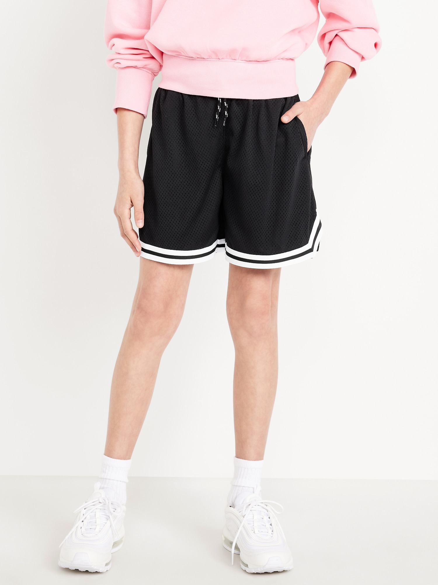 High-Waisted Mesh Basketball Shorts for Girls: high rise, elasticized waistband, adjustable drawstring, on-seam side pockets, retro striped tape trim at leg openings, vented sides, #696474